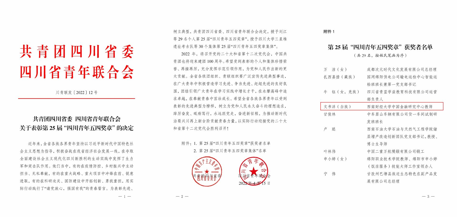 五四前夕,共青團中央印發(fā)關(guān)于表彰全國五四紅旗團委(團支部)、全國優(yōu)秀共青團員、全國優(yōu)秀共青團干部的決定,共青團四川省委、四川省青年聯(lián)合會印發(fā)關(guān)于表彰第25屆“四川青年五四獎?wù)隆钡臎Q定,共青團四川省委印發(fā)關(guān)于表彰省五四紅旗團委(團支部)、省優(yōu)秀共青團員、省優(yōu)秀共青團干部的決定,我校統(tǒng)計學(xué)院2018級經(jīng)濟統(tǒng)計專業(yè)袁秋同學(xué)榮獲“全國優(yōu)秀共青團員”,中國金融研究中心教師文書洋被授予第25屆“四川青年五四獎?wù)隆保ど坦芾韺W(xué)院團委榮獲“四川省五四紅旗團委”。