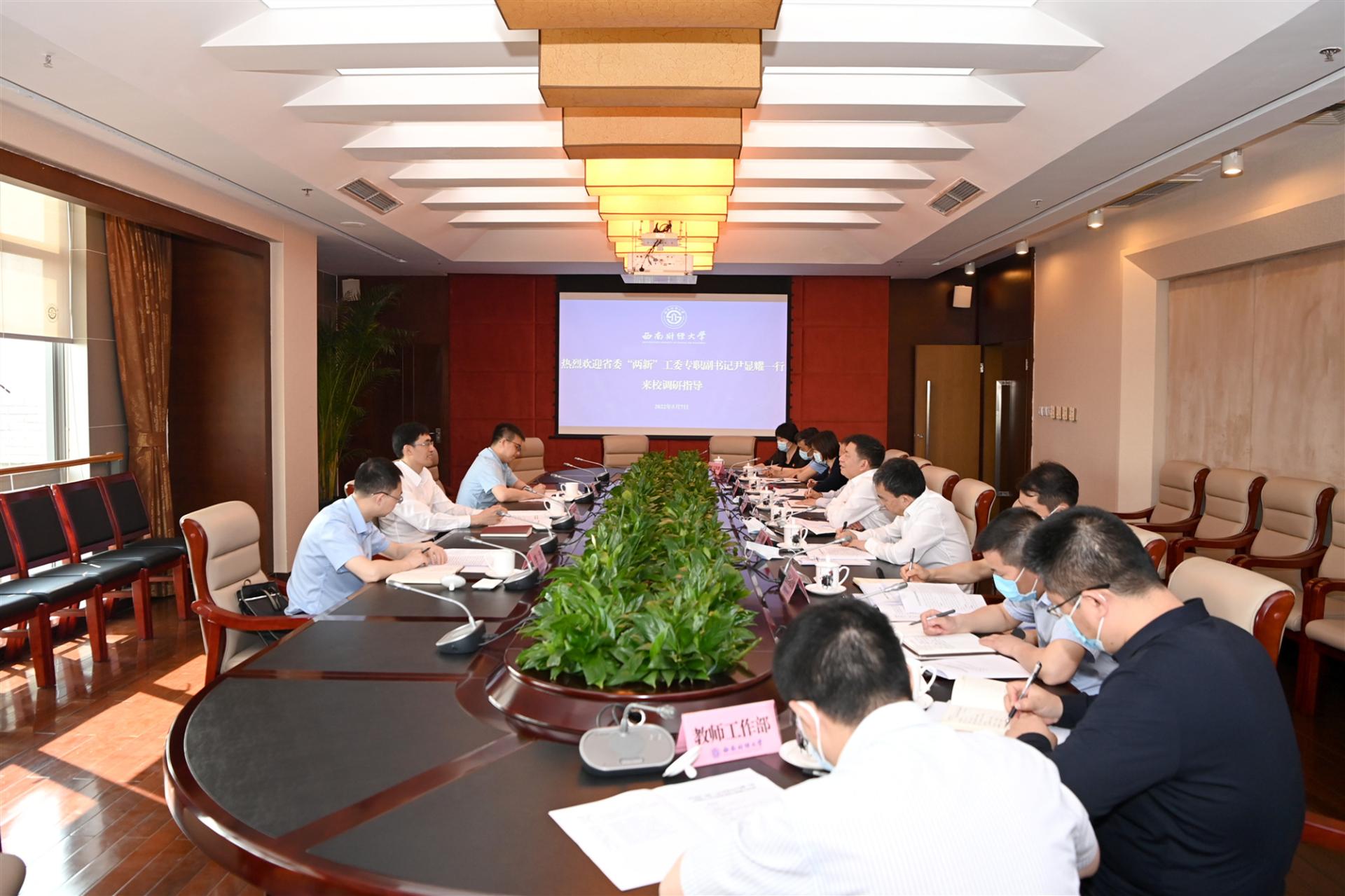 按照全國、全省組織部長會議和基層黨建工作重點任務推進會部署安排,近期,省委組織部、省委教育工委組建7個調研組分赴全省各公辦高校開展黨的建設專題調研。5月7日,四川省委“兩新”工委專職副書記尹顯耀帶領調研一組到我校開展調研。省委教育工委黨建與干部人才處副處長唐志穎、省委組織部組織三處干部李詢同志陪同調研。學校黨委書記趙德武,黨委副書記馬驍,黨委常委、副校長史代敏及相關單位負責同志參加調研座談。