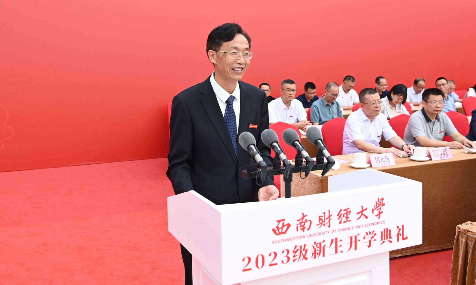 趙德武主持典禮時(shí)深情回顧了學(xué)校在98年光輝歲月中寫就的“格致誠(chéng)正、興學(xué)報(bào)國(guó)”“經(jīng)世濟(jì)民、孜孜以求”“為黨育人、為國(guó)育才”奮斗史。他指出,黨的二十大擘畫了以中國(guó)式現(xiàn)代化全面推進(jìn)中華民族偉大復(fù)興的宏偉藍(lán)圖,學(xué)校黨委深入學(xué)習(xí)貫徹黨的二十大精神,圍繞“教育強(qiáng)國(guó),西財(cái)何為?”這一重大時(shí)代課題,作出全面推進(jìn)“新財(cái)經(jīng)”戰(zhàn)略升級(jí)重大部署,在教育強(qiáng)國(guó)建設(shè)中更好展現(xiàn)西財(cái)擔(dān)當(dāng)。他強(qiáng)調(diào),新時(shí)代中國(guó)青年,生逢盛世、肩負(fù)重任,即將成為“新財(cái)經(jīng)”受益者、參與者和推動(dòng)者的2023級(jí)西財(cái)人,要立志求學(xué)、追求卓越,為一生的精彩打下堅(jiān)實(shí)的基礎(chǔ)。他深情寄語,要堅(jiān)定理想信念,在把穩(wěn)青春航向中做“有志”青年,堅(jiān)定不移聽黨話、跟黨走,自覺做習(xí)近平新時(shí)代中國(guó)特色社會(huì)主義思想的堅(jiān)定信仰者、積極傳播者、忠實(shí)踐行者,時(shí)刻關(guān)注黨和國(guó)家的大事,深入了解國(guó)情社情民情,永懷為民之志、砥礪強(qiáng)國(guó)之志、激揚(yáng)復(fù)興之志。要練就過硬本領(lǐng),在追逐青春夢(mèng)想中做“有識(shí)”青年,深刻把握世界科技前沿和國(guó)家重大戰(zhàn)略需求,敏于求知、勤于學(xué)習(xí)、勇于實(shí)踐,學(xué)會(huì)思維方法、厚實(shí)學(xué)科基礎(chǔ)、掌握硬核技術(shù),積極投身中國(guó)式現(xiàn)代化的火熱實(shí)踐,豐厚開卷有益的學(xué)識(shí)、增長(zhǎng)開闊廣博的見識(shí)、練就開拓創(chuàng)新的膽識(shí)。要矢志拼搏奮斗,在展現(xiàn)青春擔(dān)當(dāng)中做“有為”青年,深入踐行“請(qǐng)黨放心、強(qiáng)國(guó)有我”的青春誓言,時(shí)刻牢記“奮斗是青春最亮麗的底色,行動(dòng)是青年最有效的磨礪”,勇?lián)鷷r(shí)代使命、敢于迎難而上、涵養(yǎng)斗爭(zhēng)精神,積蓄敢想敢為的勇氣、涵養(yǎng)實(shí)干實(shí)為的作風(fēng)、增強(qiáng)善作善為的自覺。趙德武祝愿2023級(jí)全體新同學(xué),在西南財(cái)大加強(qiáng)品德修養(yǎng)、增長(zhǎng)知識(shí)見識(shí)、培養(yǎng)奮斗精神、增強(qiáng)綜合素質(zhì),立大志、明大德、成大才、擔(dān)大任,以實(shí)際行動(dòng)在強(qiáng)國(guó)建設(shè)、民族復(fù)興偉業(yè)中書寫新時(shí)代西財(cái)青年的最美華章!
