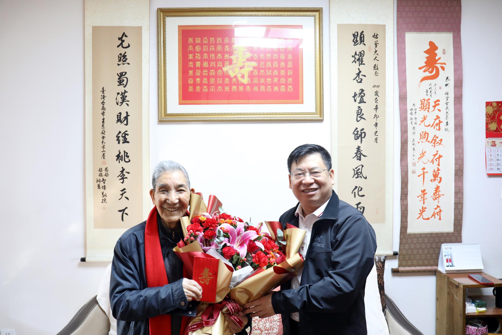 福星呈瑞彩,金秋喜盈懷。10月14日,我校會計學院教授稅顯光迎來了104周歲生日,校黨委書記趙德武來到稅顯光教授家中看望慰問,代表學校向他致以生日的祝賀,并送上真摯的祝福。離退休工作處負責人參加慰問。