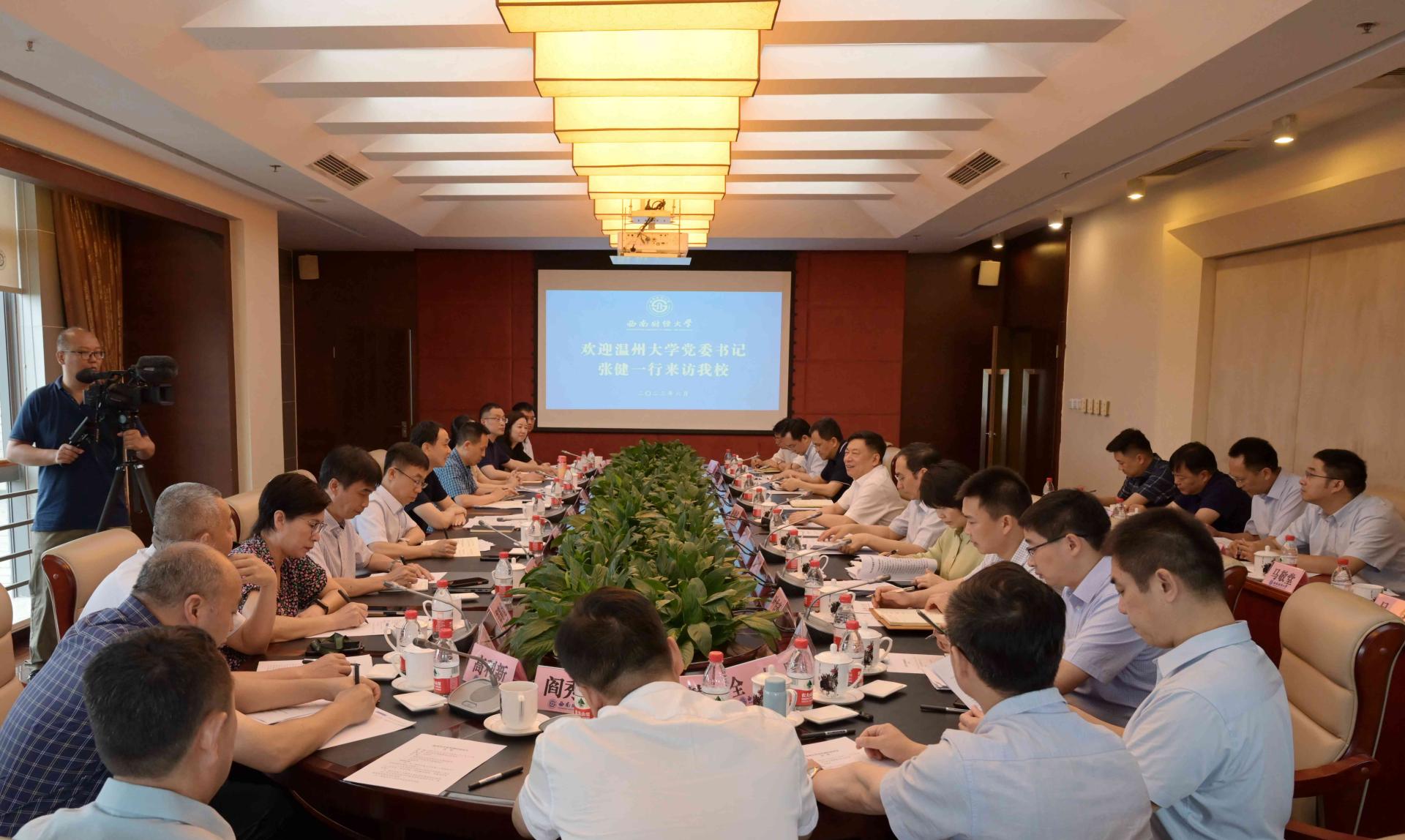 張健對我校的熱情接待表示感謝,他介紹了溫州大學的歷史沿革,圍繞從嚴治黨、人才培養、學科建設、社會服務、文化傳承、國際合作六方面介紹了溫州大學發展近況。他表示,西南財經大學在師資隊伍建設、學科建設等方面取得顯著成效,希望通過此次來訪調研學習,加強溝通對接,進一步深化拓展雙方交流合作。