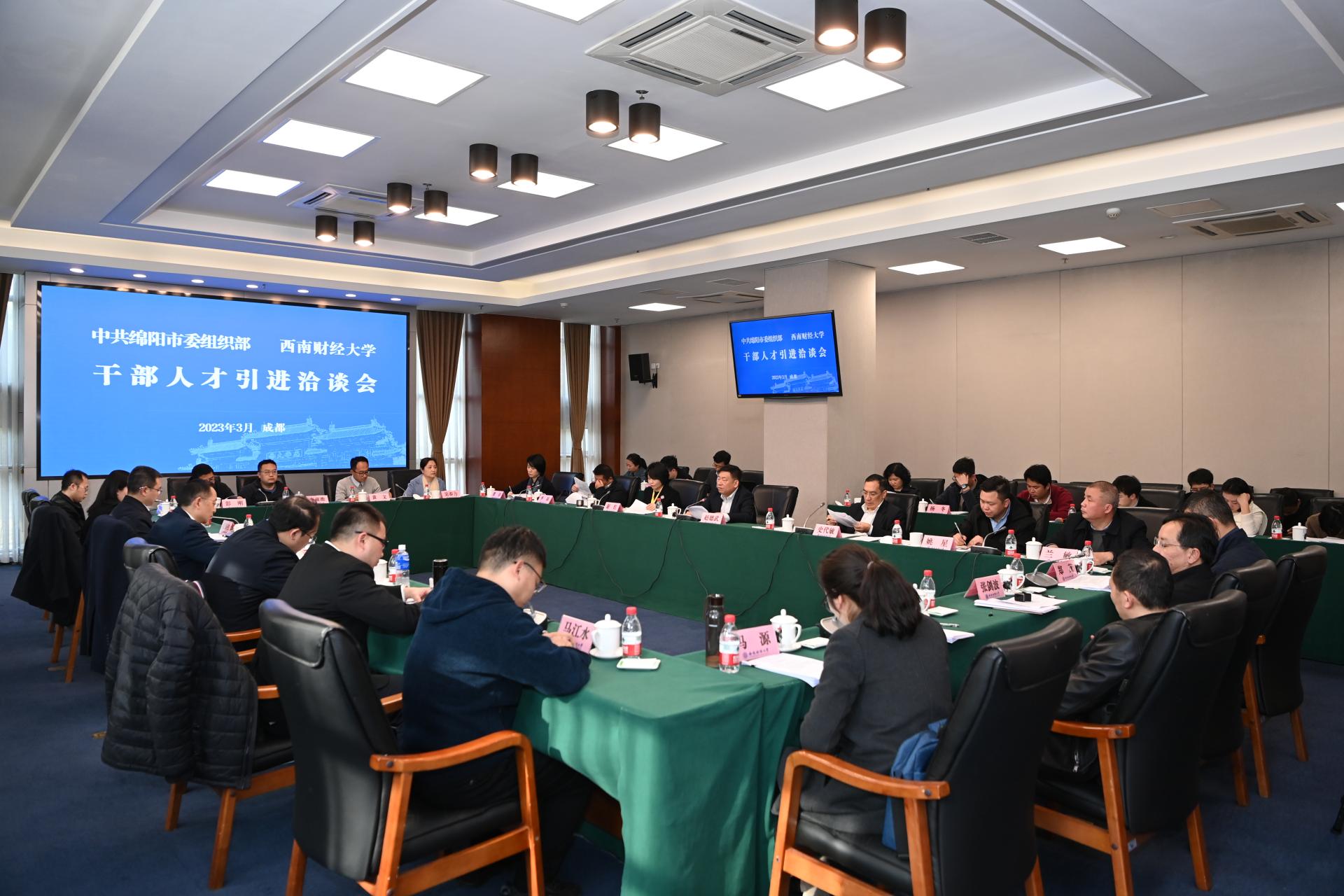 推介招聘會后,綿陽市委組織部干部人才洽談會在弘遠樓105會議室舉行,莫懷學一行與我校對接洽談引進高素質專業化干部和高層次人才工作。會上,趙德武介紹了學校基本情況,交流了近年來學校黨委深入推進“建設新文科、引領新財經、創造新優勢”戰略實踐的成果亮點,以及學校人才隊伍建設成效和下一步思考。他表示,這次干部人才引進交流是雙方深入學習貫徹黨的二十大科教興國戰略部署的一致行動,是深化校地合作、推進產教融合的重要舉措,對于我校促進干部人才隊伍建設、推動“新財經”戰略升級具有重要意義。綿陽是紅色熱土、科技沃土、奮斗樂土,學校將以此次干部人才掛職作為重要契機,進一步完善選拔培育和管理機制,選拔一批優秀青年人才到綿陽交流鍛煉,助力教師個人成長、助推學校事業發展。趙德武還對人才交流引進的進一步合作提出建議。莫懷學深入介紹了綿陽市委與我校在高層次專業化人才引進等方面深化合作的思路,希望下一步與學校加大力度深化推進在人才引育等多方面合作。莫懷學表示,一年來綿陽市委深入推進“人才興市”戰略,廣納海內外英才,誠邀我校高素質專業化領導人才前往綿陽任職掛職,綿陽將竭盡所能提供工作生活便利,讓來綿人才在科技城工作舒心、生活開心。江保權介紹了綿陽高素質專業化干部需求以及待遇保障等情況。隨后,莫懷學一行與我校有意前往綿陽任職掛職的參會教師和二級單位負責人圍繞各類高層次專業化崗位具體工作要求、進一步開展校地合作的形式途徑等內容展開了熱烈深入的交流探討。