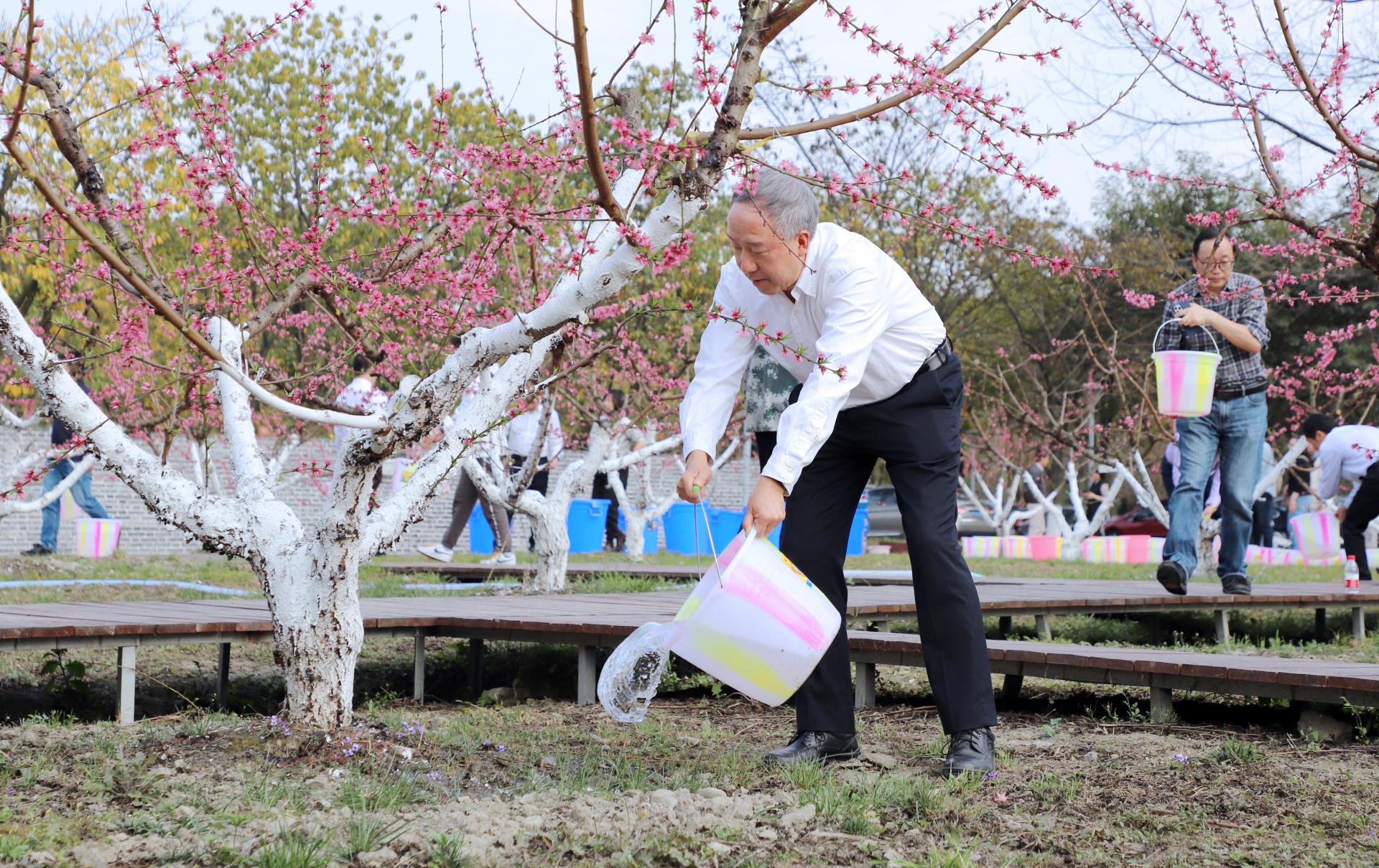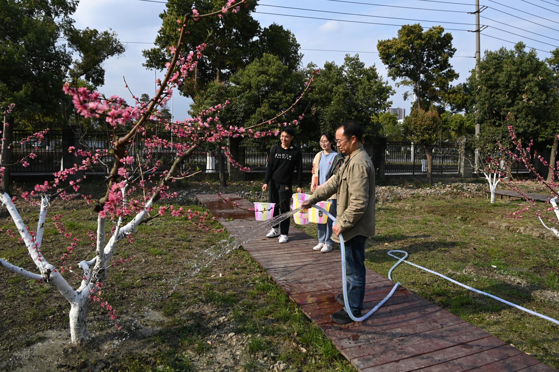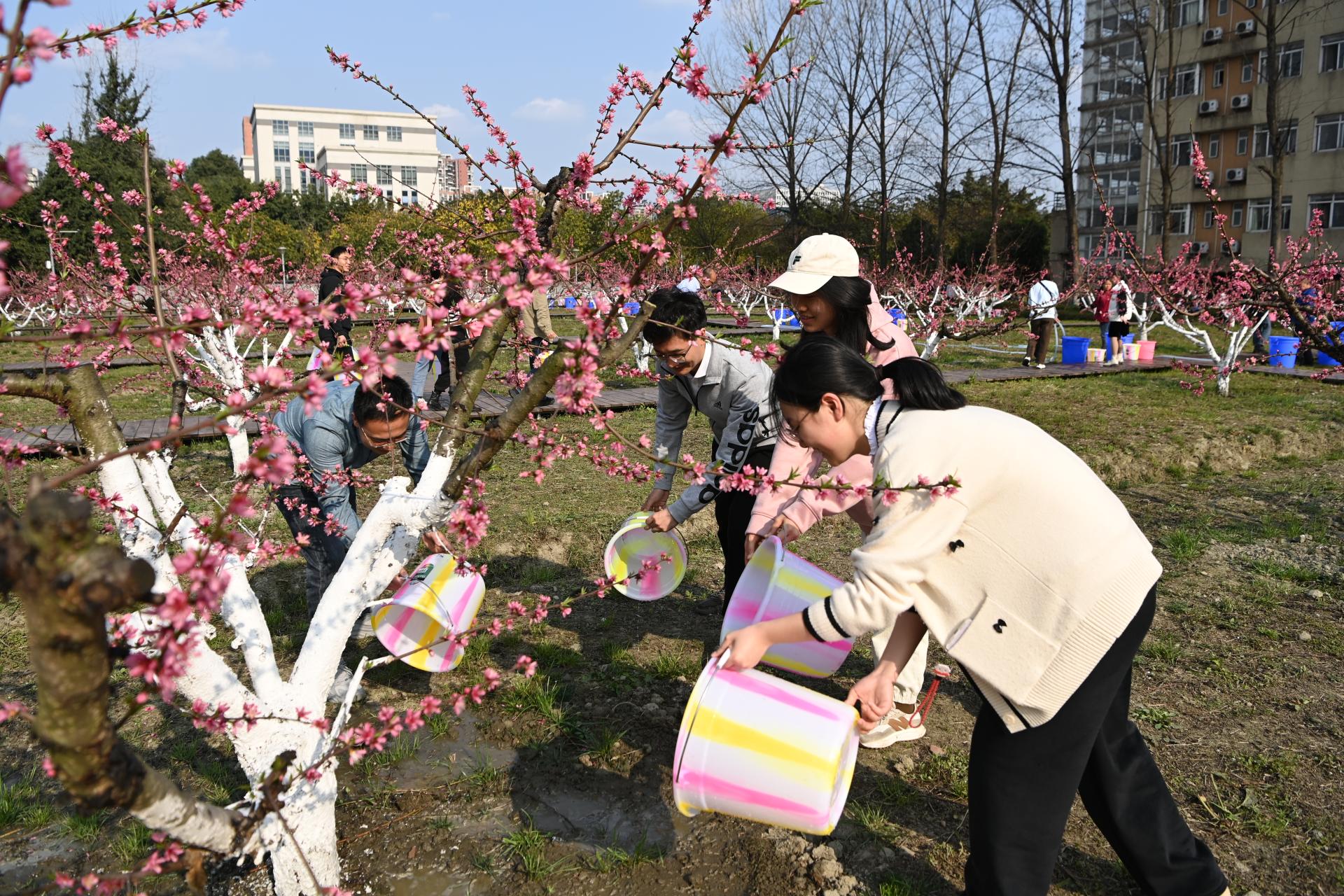 下午4時,植樹節澆水施肥活動在柳林和光華校區同時舉行。在柳林“耕讀田園”果蔬種植勞動實踐基地,春桃翻霞,人潮涌動,一派農忙景象。在校領導的帶領下,師生們打水、分水、擔水、灌園,穿梭于壟上小道,澆灌希望的田園,充分享受勞動帶來的快樂?!叭址N樹七分管,十分成活才保險?!痹诠馊A校區光華樓西側草坪,師生們在園藝師傅的示范下熱火朝天地分頭行動,對玉蘭、香樟、桂樹等園木綠植精準施肥灌溉,為綠色校園貢獻力量。