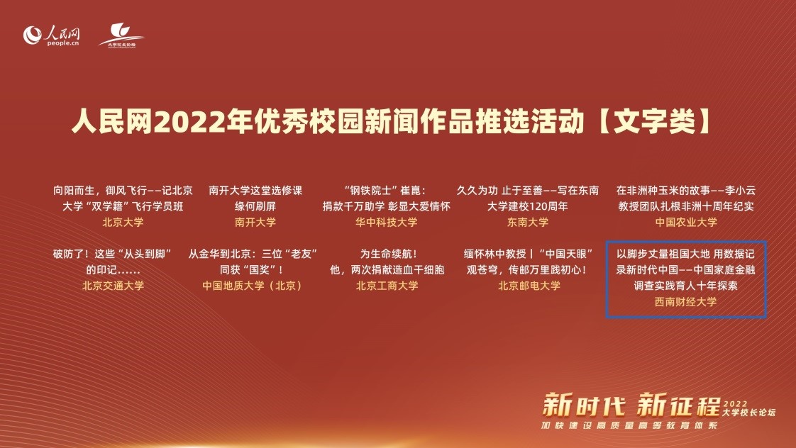 12月27日,以“新時(shí)代·新征程 加快建設(shè)高質(zhì)量高等教育質(zhì)量體系”為主題的人民網(wǎng)2022大學(xué)校長(zhǎng)論壇在吉林長(zhǎng)春舉行。論壇上公布了“人民網(wǎng)2022年高校優(yōu)秀校園新聞作品”。我校報(bào)送作品《以腳步丈量祖國(guó)大地 用數(shù)據(jù)記錄新時(shí)代中國(guó)——中國(guó)家庭金融調(diào)查實(shí)踐育人十年探索》入選文字類優(yōu)秀作品。