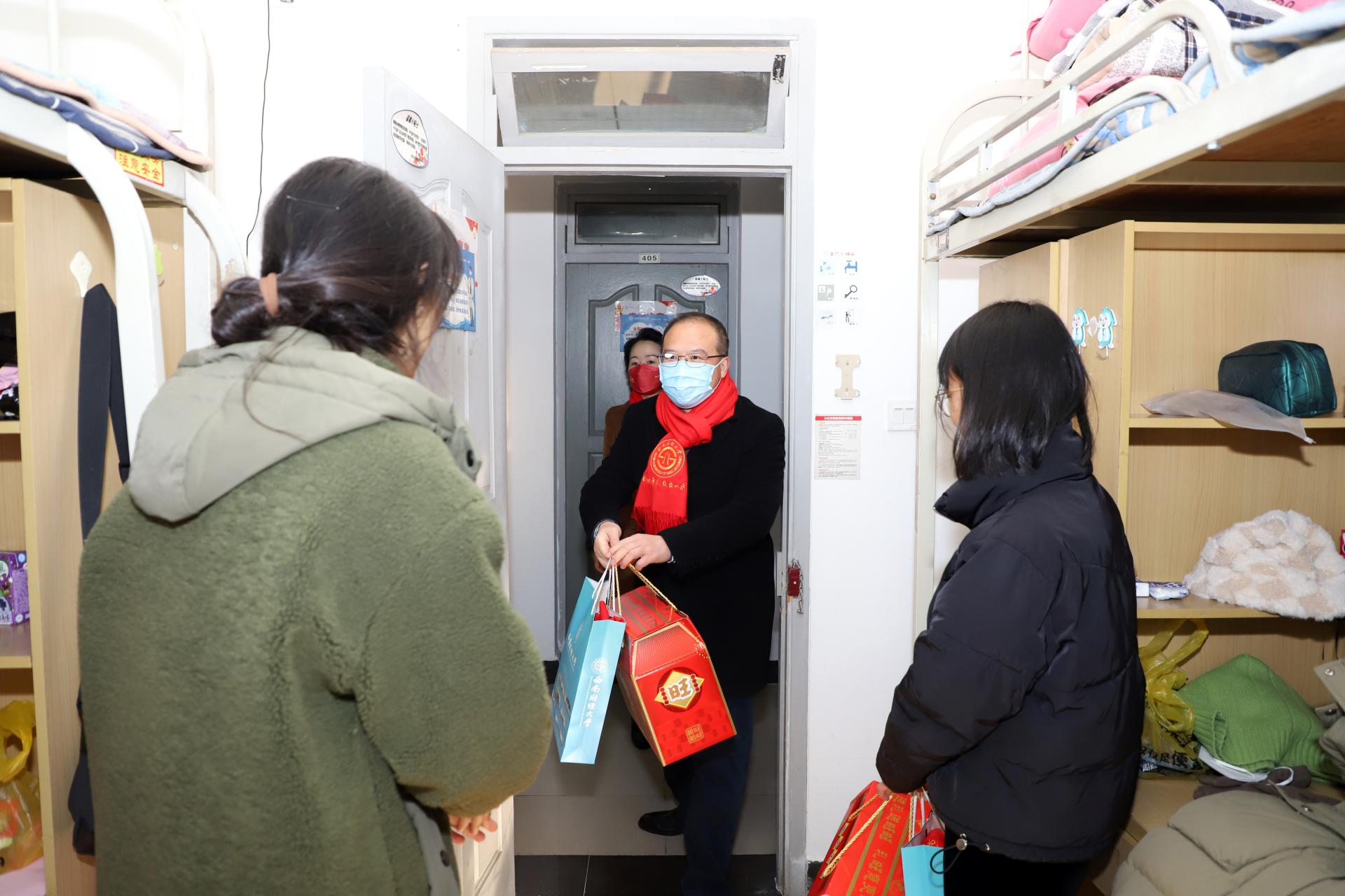 學校高度重視寒假期間留校學生的關心關愛工作。1月19日上午,校領導一行到宿舍慰問留校學生,與學生親切交流,關心詢問留校學生假期的生活、學習情況,給同學們帶來了春節前夕的問候和祝福,并送上春節暖心大禮包。