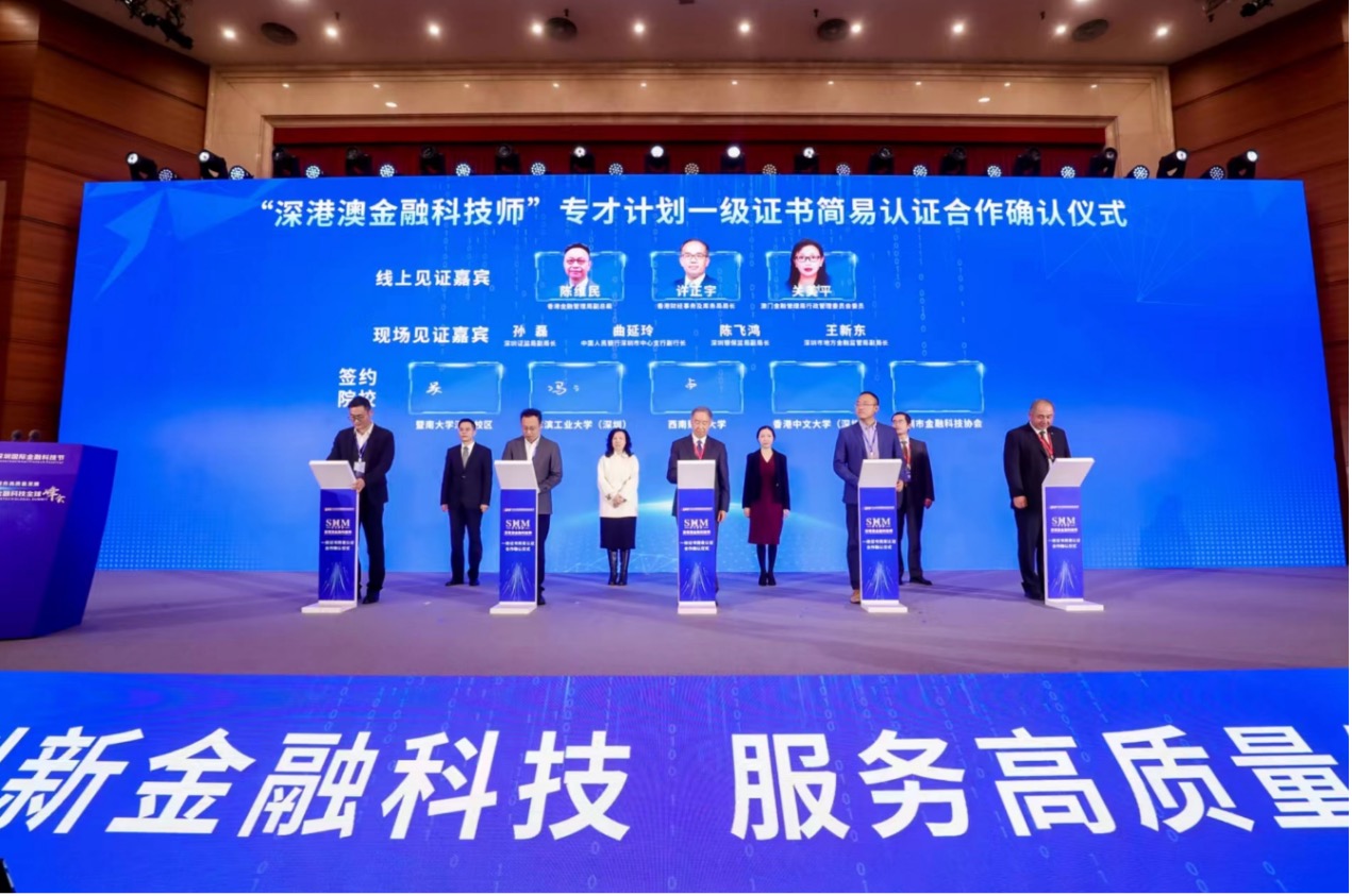 峰會主論壇舉行了“深港澳金融科技師”專才計劃一級證書簡易認證合作確認儀式。卓志代表學校與香港中文大學(深圳)、哈爾濱工業大學(深圳)、暨南大學等一起加入“深港澳金融科技師”專才計劃一級證書簡易認證體系。 作為大灣區金融科技人才培養的亮點工程,“深港澳金融科技師專才計劃”經過前期建設已成效初顯,成為高校探索全新金融科技人才培養模式的重要嘗試,為深港澳三地的金融科技發展提供了優質人才。