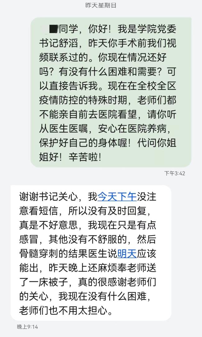 計算機與人工智能學(xué)院黨委在突發(fā)事件中進一步彰顯疫情防控西財溫度。24日晚,學(xué)院了解到一名學(xué)生出現(xiàn)高熱情況后,立即按照疫情防控工作規(guī)范緊急送醫(yī)。在學(xué)生進行手術(shù)檢查全程,學(xué)院始終與學(xué)生密切溝通、安撫心理,做好術(shù)前協(xié)調(diào)、術(shù)中守護、術(shù)后照料,為學(xué)生購買住院生活必需品,等待家長從外地赴蓉做好交接……身在校內(nèi)參加防疫工作的學(xué)院領(lǐng)導(dǎo)通過視頻鼓勵學(xué)生積極勇敢堅強面對,學(xué)生在術(shù)后短信中表示“真的很感激老師們的關(guān)心”,請老師們不用太擔(dān)心。
