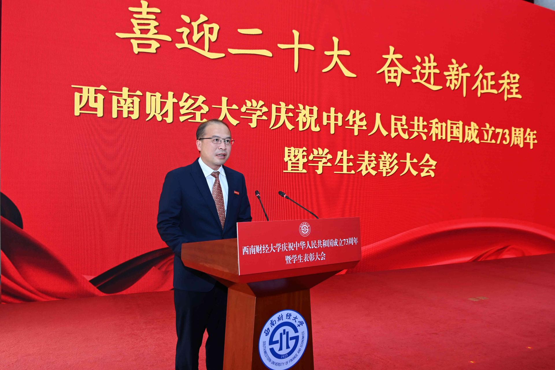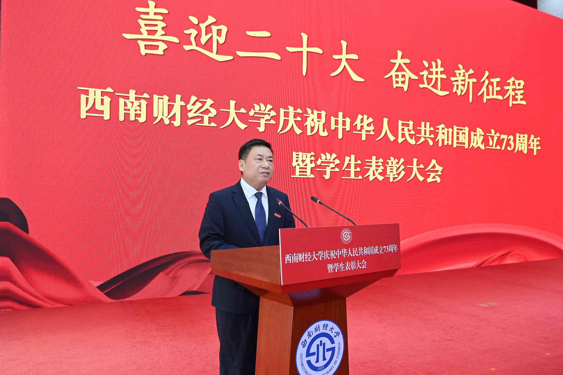 趙德武代表學校黨委和行政,向全校師生員工致以節日的問候,向受到表彰的先進集體和優秀個人表示熱烈的祝賀,深情寄語西財青年“喜迎二十大、永遠跟黨走、奮進新征程,努力成長為堪當民族復興重任的時代新人”。