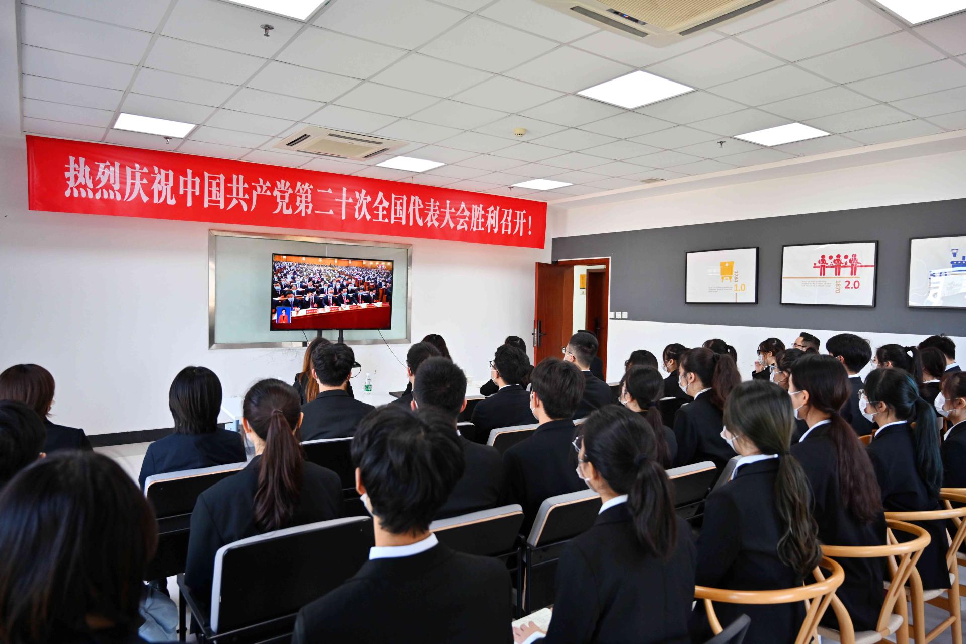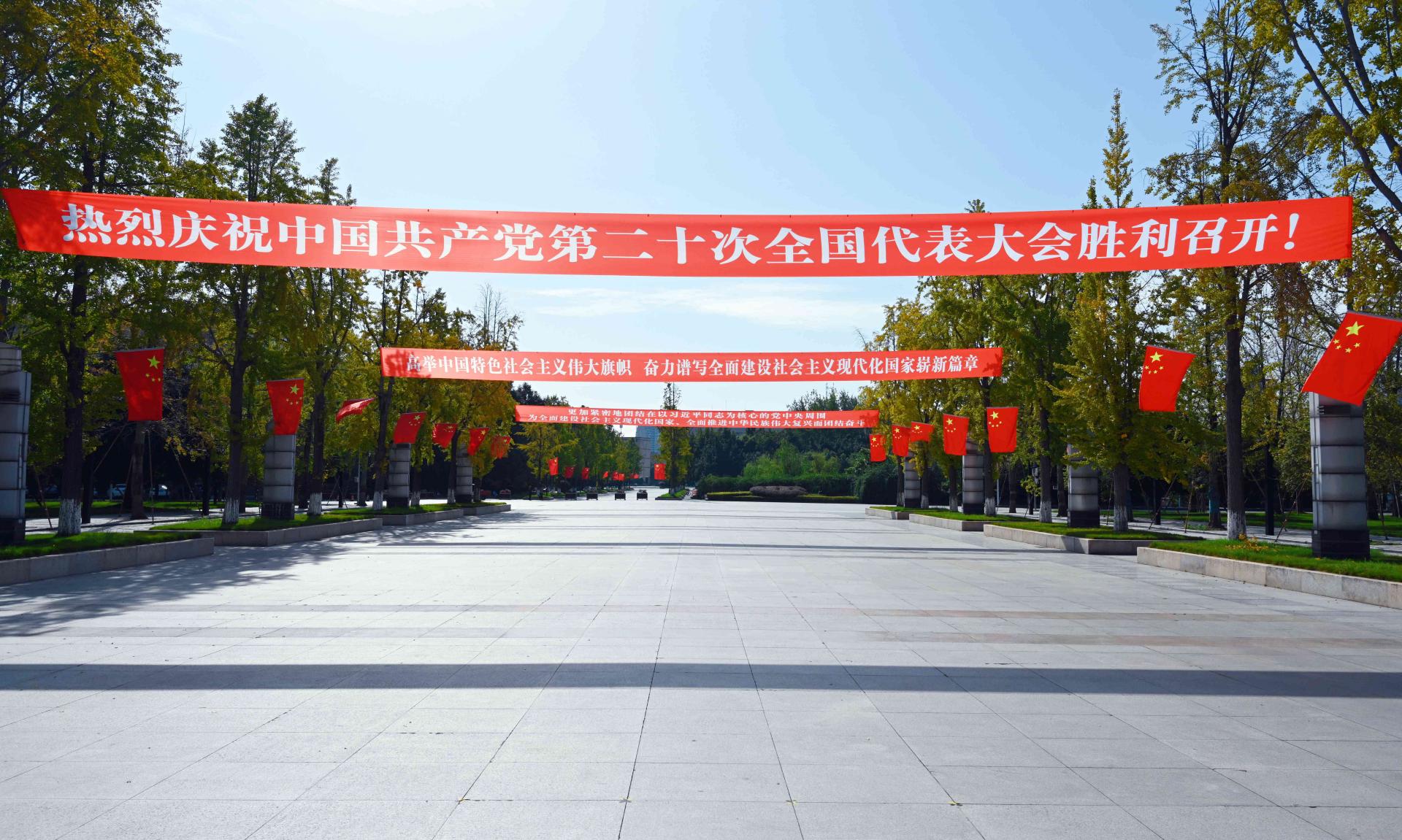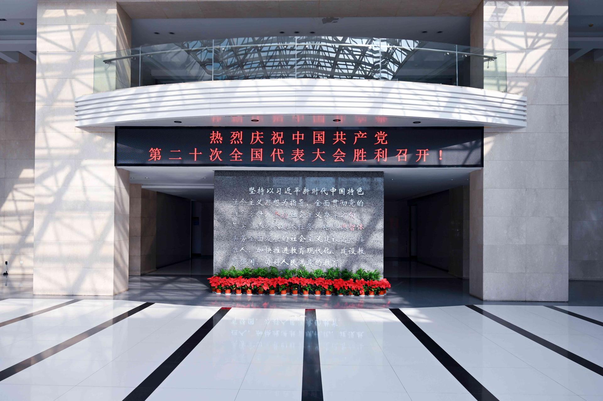 校園內(nèi)排列整齊的五星紅旗迎風招展,鮮艷橫幅與藍天綠樹映照成畫。“熱烈慶祝中國共產(chǎn)黨第二十次全國代表大會勝利召開”和“高舉中國特色社會主義偉大旗幟,奮力譜寫全面建設社會主義現(xiàn)代化國家嶄新篇章”橫幅在主會場內(nèi)高高懸掛,黨員徽章在黨員干部師生胸前熠熠生輝。