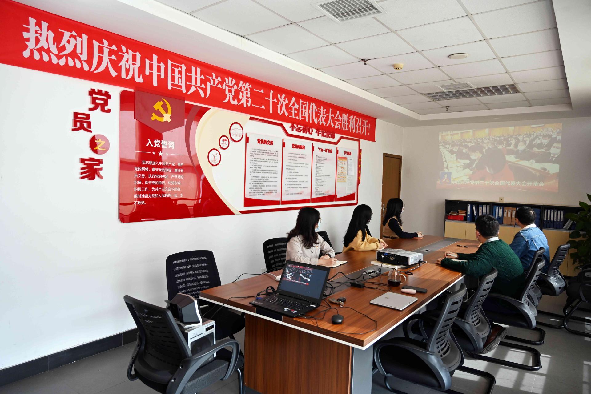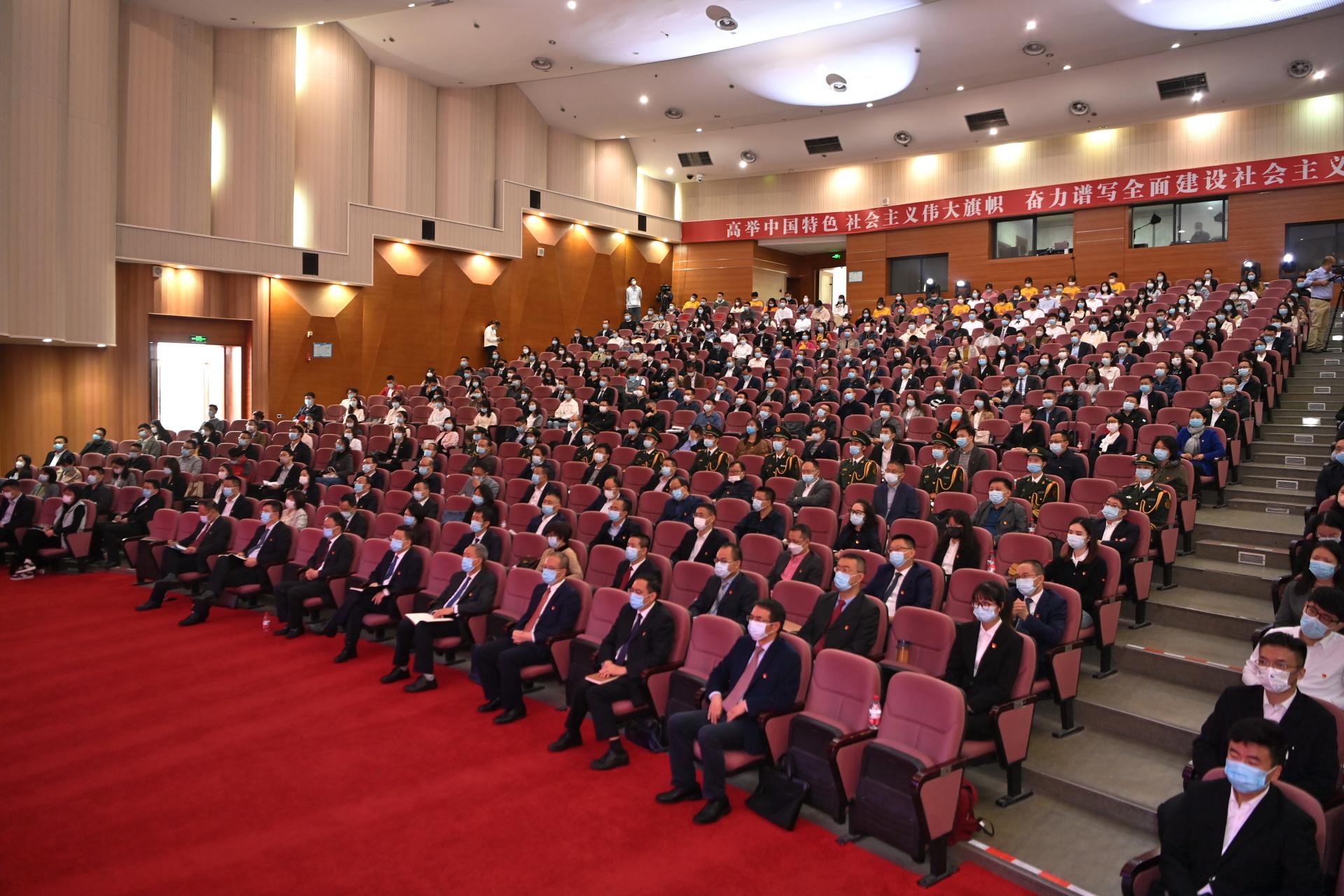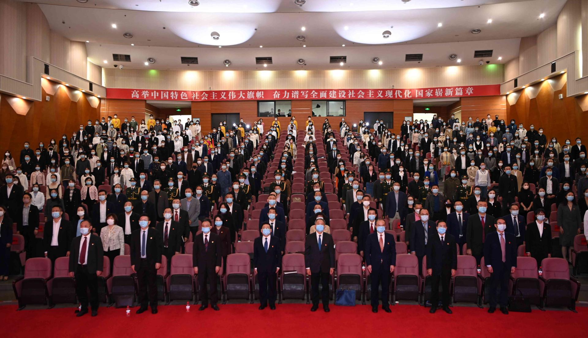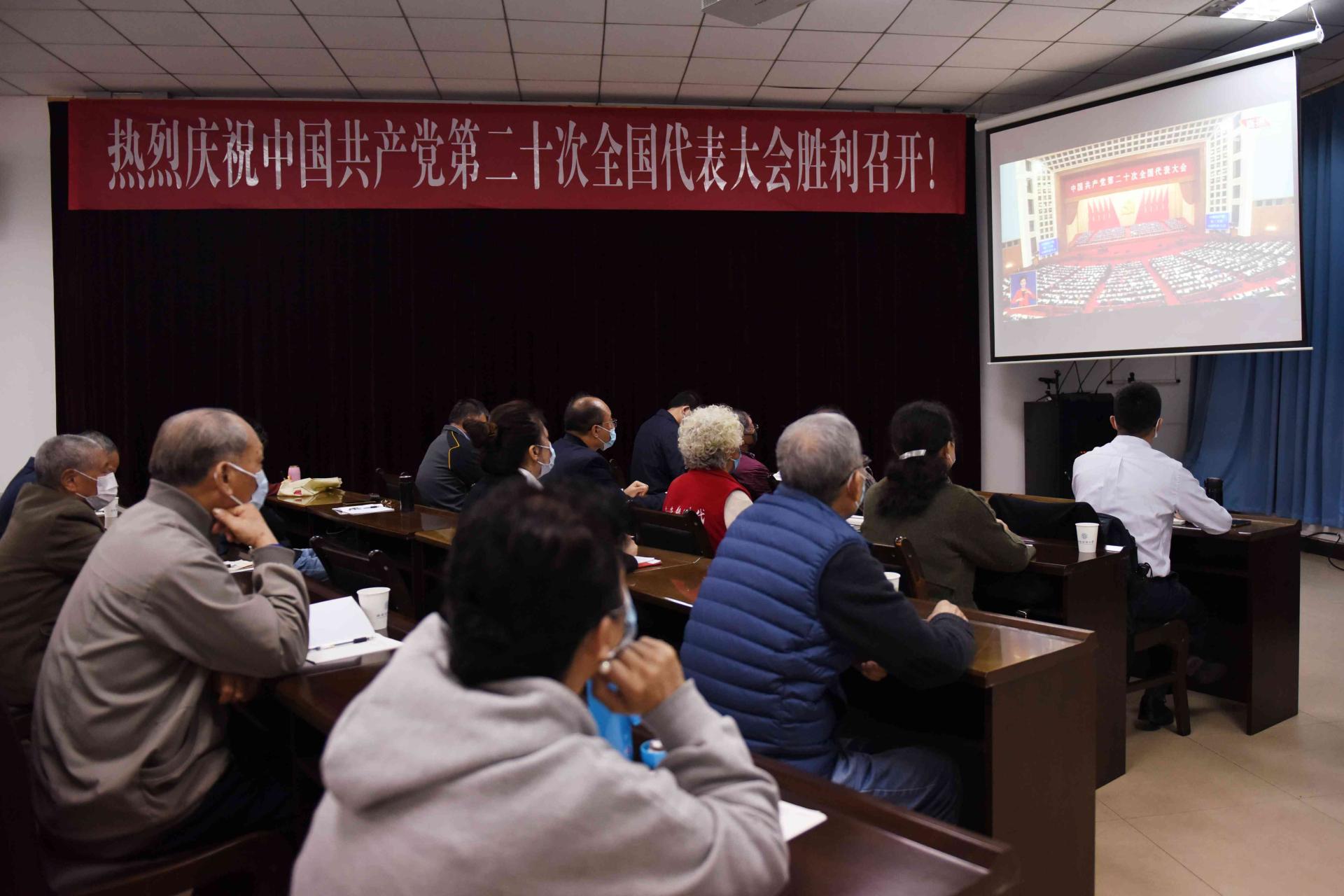 校園內(nèi)排列整齊的五星紅旗迎風招展,鮮艷橫幅與藍天綠樹映照成畫。“熱烈慶祝中國共產(chǎn)黨第二十次全國代表大會勝利召開”和“高舉中國特色社會主義偉大旗幟,奮力譜寫全面建設社會主義現(xiàn)代化國家嶄新篇章”橫幅在主會場內(nèi)高高懸掛,黨員徽章在黨員干部師生胸前熠熠生輝。