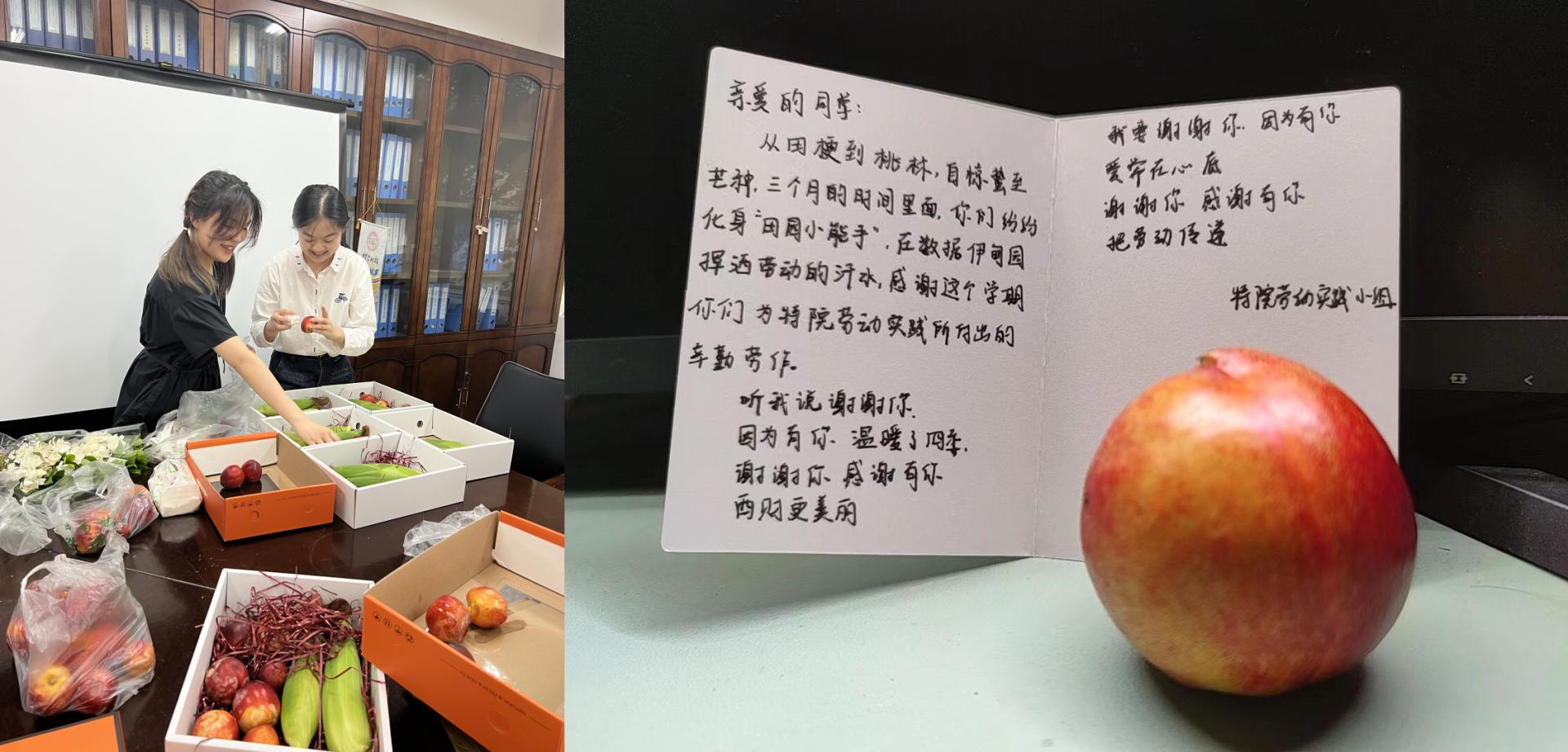 同時,各學院(研究院)組織開展“共享勞動果實 傳承勞動精神”勞動教育畢業生系列活動,祝福畢業生圓滿完成學業,并鼓勵大家繼續傳承、發揚勞動精神。金融學院與中國金融研究院組織畢業生代表親手將收獲的果實制作成水果蛋糕,分享給學院師生;統計學院組織學生制作水果禮盒,附上祝福的卡片,送至各班老師;數學學院舉辦畢業生專題座談會,共享勞動果實,共話勞動精神;特拉華數據科學學院別出心裁,設計水果盲盒,并由勞動實踐小組的同學寫好感恩卡片,贈送給學院老師,以表達學子們對老師的感激之情等等。
