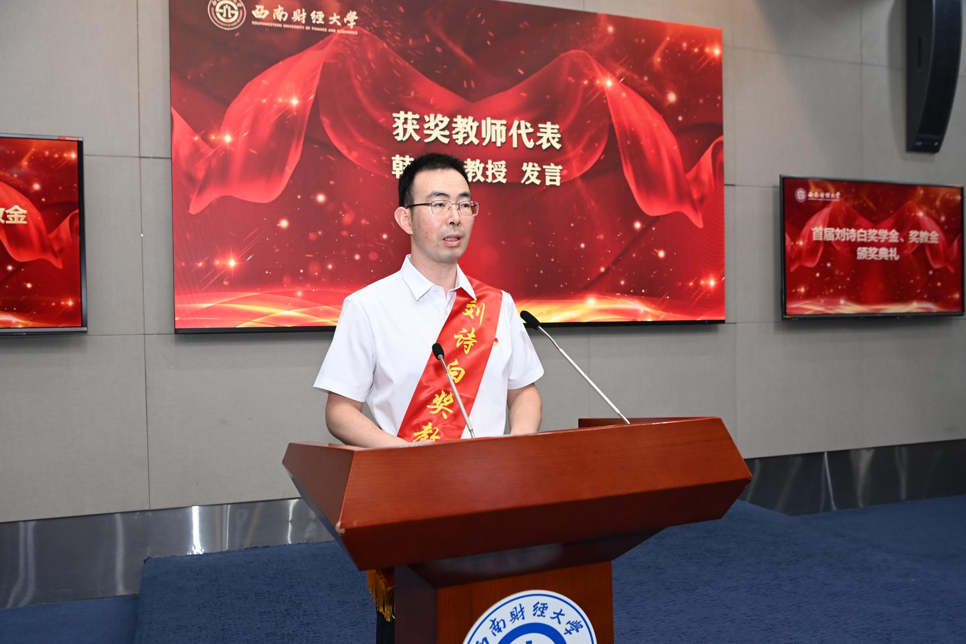 曾道榮宣讀了表彰西南財經大學首屆劉詩白獎學金、獎教金獲得者的決定。獲獎教師代表韓文龍發(fā)言表示,將賡續(xù)馬克思主義政治經濟學的“紅色基因”,潛心治學,以德施教,成為塑造學生品格、品行、品味的引路人。獲獎學生代表劉銳代表西財學子向劉詩白教授致以崇高敬意,對母校的悉心培養(yǎng)表達了誠摯的感謝,他用“澆灌夢想”“追逐夢想”“賡續(xù)夢想”三個關鍵詞分享了自己在西財?shù)某砷L故事。