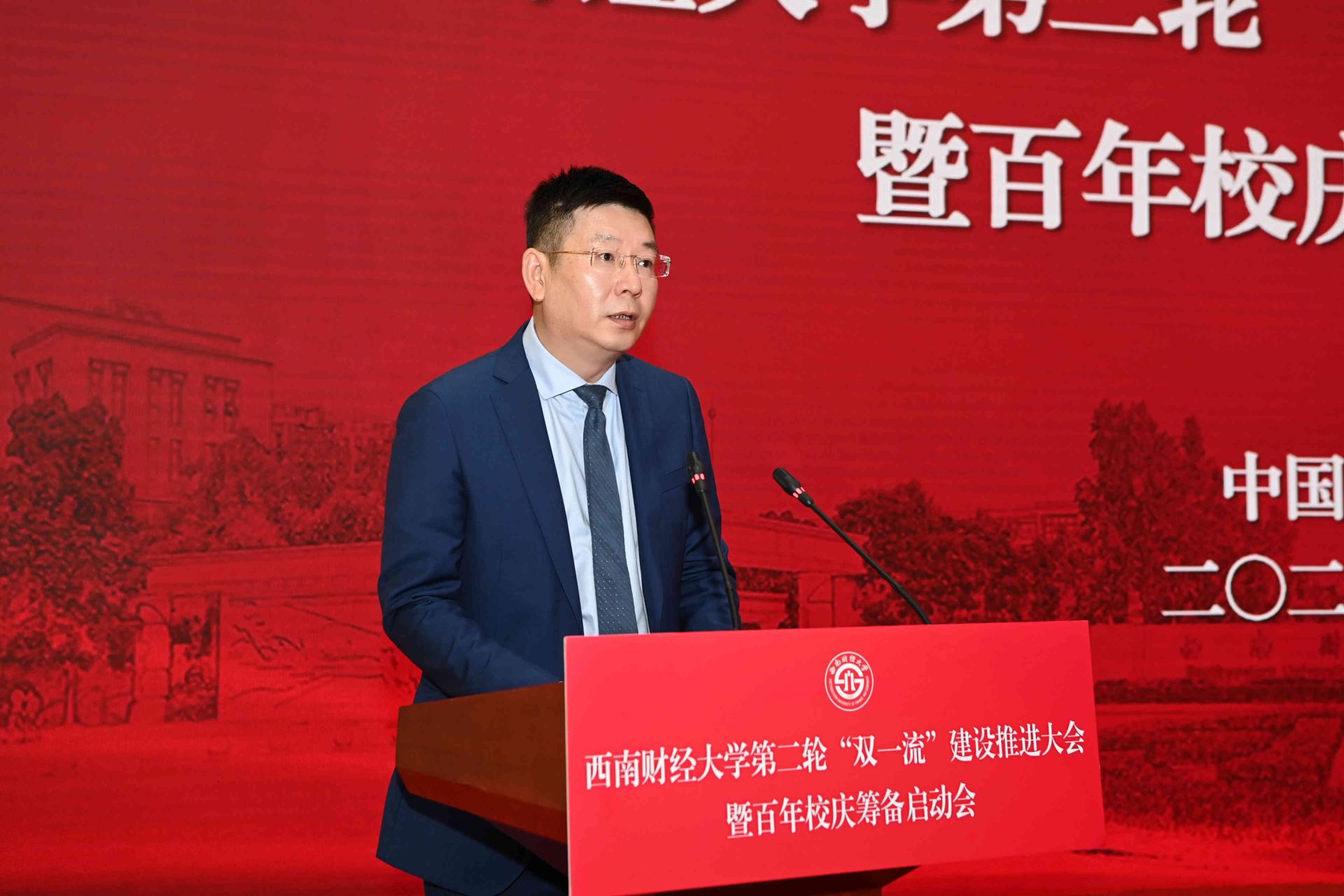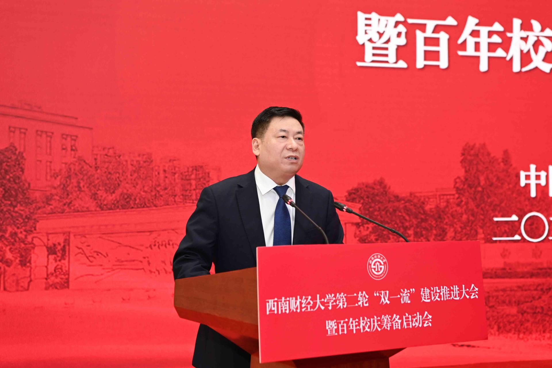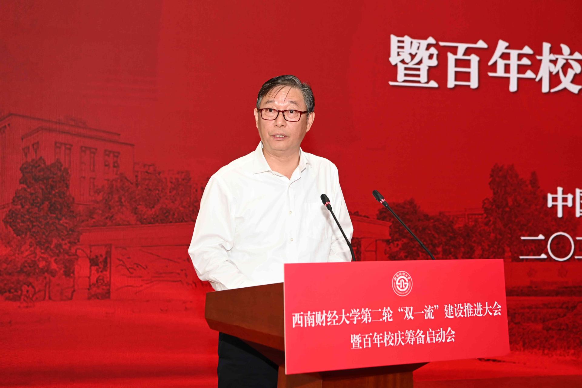 陳朝先在致辭中表示,“雙一流”建設是黨和國家賦予高等教育的重要使命,省委省政府高度重視發(fā)展高等教育,自“雙一流”建設啟動以來,始終堅持以高度政治自覺,從戰(zhàn)略高度扎實推進。西南財大等川內“雙一流”建設高校全力拼搏、奮力貢獻,取得了矚目成績。他指出,擁有97年辦學歷史的西南財大是國家高等教育事業(yè)弘篇中的精彩一頁,希望學校在第二輪“雙一流”建設中彰顯優(yōu)勢特色,搶抓時代機遇,服務國之大者,在“跳出教育看教育、跳出現(xiàn)狀找差距、跳出四川找標桿”過程中,聚焦打好“金融、西部、科技、國際”四張牌,充分發(fā)揮西財在經(jīng)濟、管理等方面的優(yōu)勢,主動對接、主動服務國家區(qū)域重大戰(zhàn)略需求,在成渝地區(qū)雙城經(jīng)濟圈建設、“西數(shù)東算”戰(zhàn)略布局、西部金融中心建設中找準結合點,聚焦鄉(xiāng)村振興、共同富裕、數(shù)字經(jīng)濟、碳達峰碳中和等領域攻堅克難、主動服務,努力培養(yǎng)國家急需的卓越財經(jīng)人才和新時代治蜀興川人才,為全面建設社會主義現(xiàn)代化國家、推動新時代治蜀興川再上新臺階作出更大貢獻。