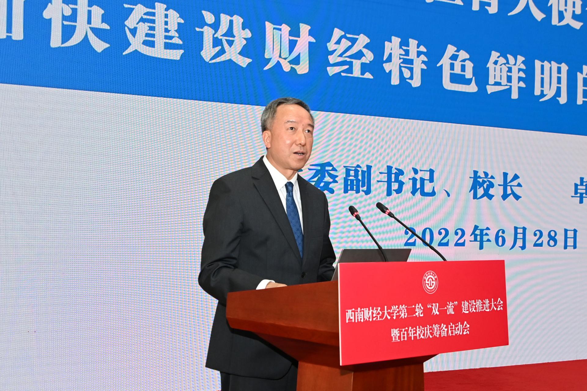 黨委副書記、校長卓志以《扎根中國大地 勇?lián)耸姑?服務國之大者 加快建設財經(jīng)特色鮮明的世界一流大學》為題作報告。他誠摯感謝全體西財人對學校首輪“雙一流”建設的辛勤付出,回顧了學校首輪“雙一流”建設的成效,介紹了第二輪“雙一流”建設的進展,從五個方面對深入推進第二輪“雙一流”建設作出部署安排。卓志指出,立足新時代新征程,第二輪“雙一流”建設使命光榮、任重道遠,要深刻認識第二輪“雙一流”建設的重大意義,自覺貫徹落實黨中央決策部署,推進高等財經(jīng)教育創(chuàng)新發(fā)展,為“百年西財”奠定堅實基礎。要領會把握第二輪“雙一流”建設的鮮明導向,更加突出培養(yǎng)一流人才,更加突出服務國家戰(zhàn)略需求,更加突出爭創(chuàng)世界一流,奮力推進新時代高等財經(jīng)教育高質量發(fā)展。要精準明晰第二輪“雙一流”建設的目標要求,把堅持和加強黨的全面領導作為根本保證,把主動服務國家重大戰(zhàn)略作為最高追求,把建設“新財經(jīng)”作為創(chuàng)新發(fā)展的戰(zhàn)略引領,把質量提升內涵發(fā)展作為基本路徑,把深化體制機制綜合改革作為重要動力,奮力書寫新時代高等財經(jīng)教育創(chuàng)新發(fā)展“奮進之筆”。要全力落實第二輪“雙一流”建設的任務舉措,著力提升學生全面發(fā)展力、學者綜合競爭力、學術服務貢獻力、學科國際影響力、西財文化軟實力。要齊心協(xié)力共創(chuàng)一流,提高政治站位、著眼大局謀發(fā)展,發(fā)揚奮斗精神、凝心聚力抓落實,堅持穩(wěn)中求進、久久為功創(chuàng)一流,以好的建設成效接受黨和國家以及全體西財人的檢閱。卓志強調,站在新的歷史起點,全體西財人要團結奮進、主動作為、攻堅克難,全力推進第二輪“雙一流”建設,加快建設財經(jīng)特色鮮明的世界一流大學,為建設社會主義現(xiàn)代化強國作出新的更大貢獻。
