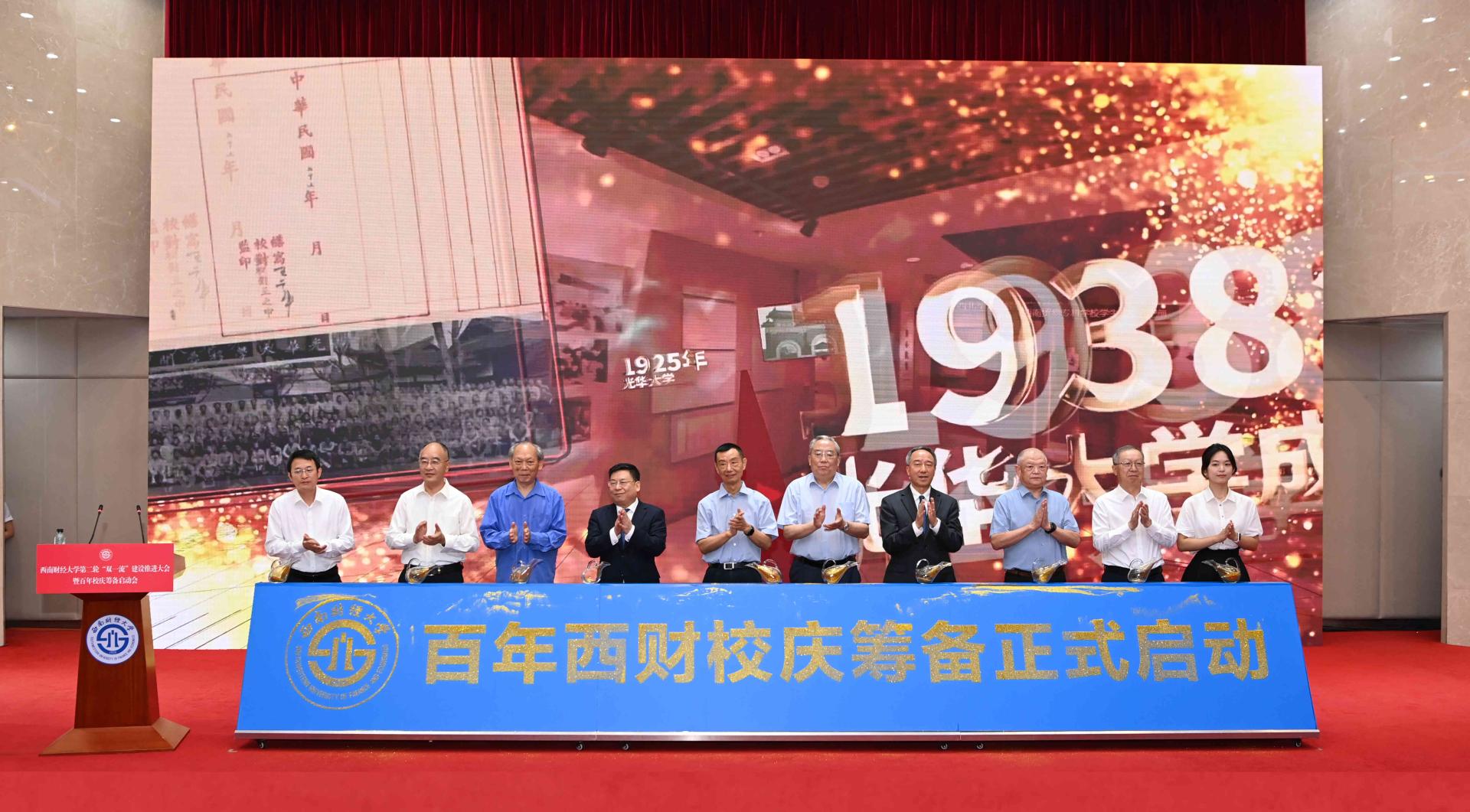 會議最后,學校隆重啟動百年校慶籌備工作。學校老領導代表涂文濤、王裕國,現(xiàn)任校領導代表趙德武、卓志,校友代表王永亮、任道德、曾永江、吳剛,教師代表楊作廩,學生代表潘藝文一同登臺,他們手持金沙瓶,在鎏金沙啟動臺上徐徐灑下金沙,“百年西財校慶籌備正式啟動”字樣隨之熠熠生輝,引來全場掌聲雷動。