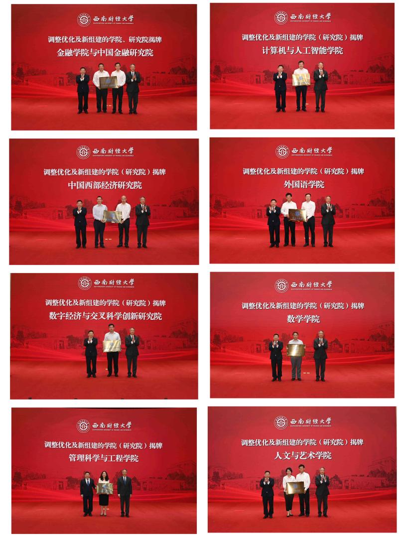 會上,趙德武、卓志為調整優(yōu)化和新組建的金融學院與中國金融研究院、中國西部經(jīng)濟研究院、數(shù)字經(jīng)濟與交叉科學創(chuàng)新研究院、管理科學與工程學院,以及更名的計算機與人工智能學院、外國語學院、數(shù)學學院、人文與藝術學院授牌,各相關單位負責同志上臺接牌。