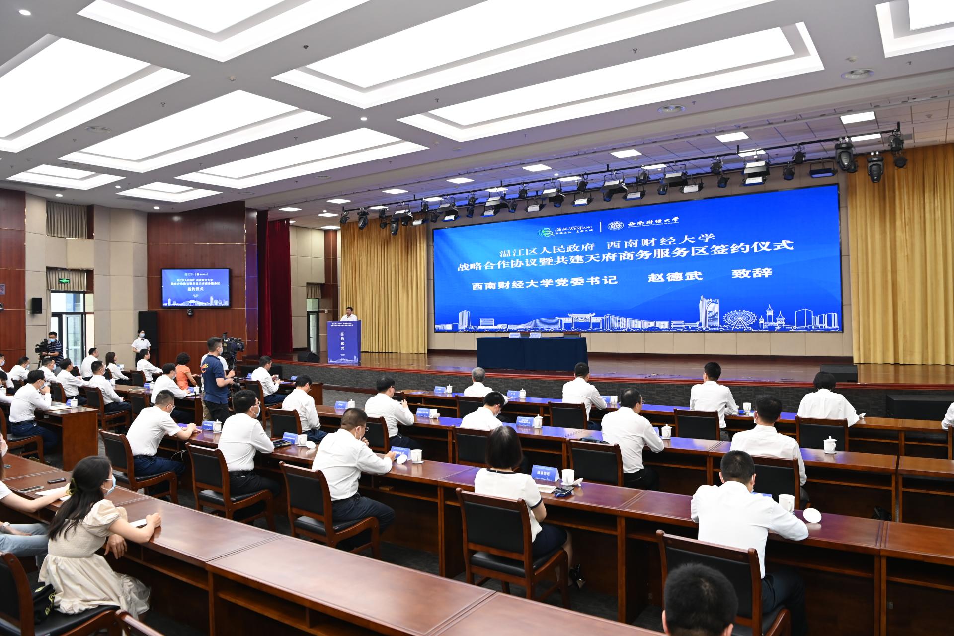 在雙方與會人員見證下,劉擁軍和尹慶雙代表雙方簽署了戰略合作協議。按照協議內容雙方將開展深入合作,以成渝地區雙城經濟圈建設為契機,以“三個做優做強”為牽引,以共建天府商務服務區為核心,構建環西南財經大學知識經濟圈,為溫江建設“幸福溫江·美好之城”“三個之區”和助推西南財經大學建設世界一流大學提供支撐。