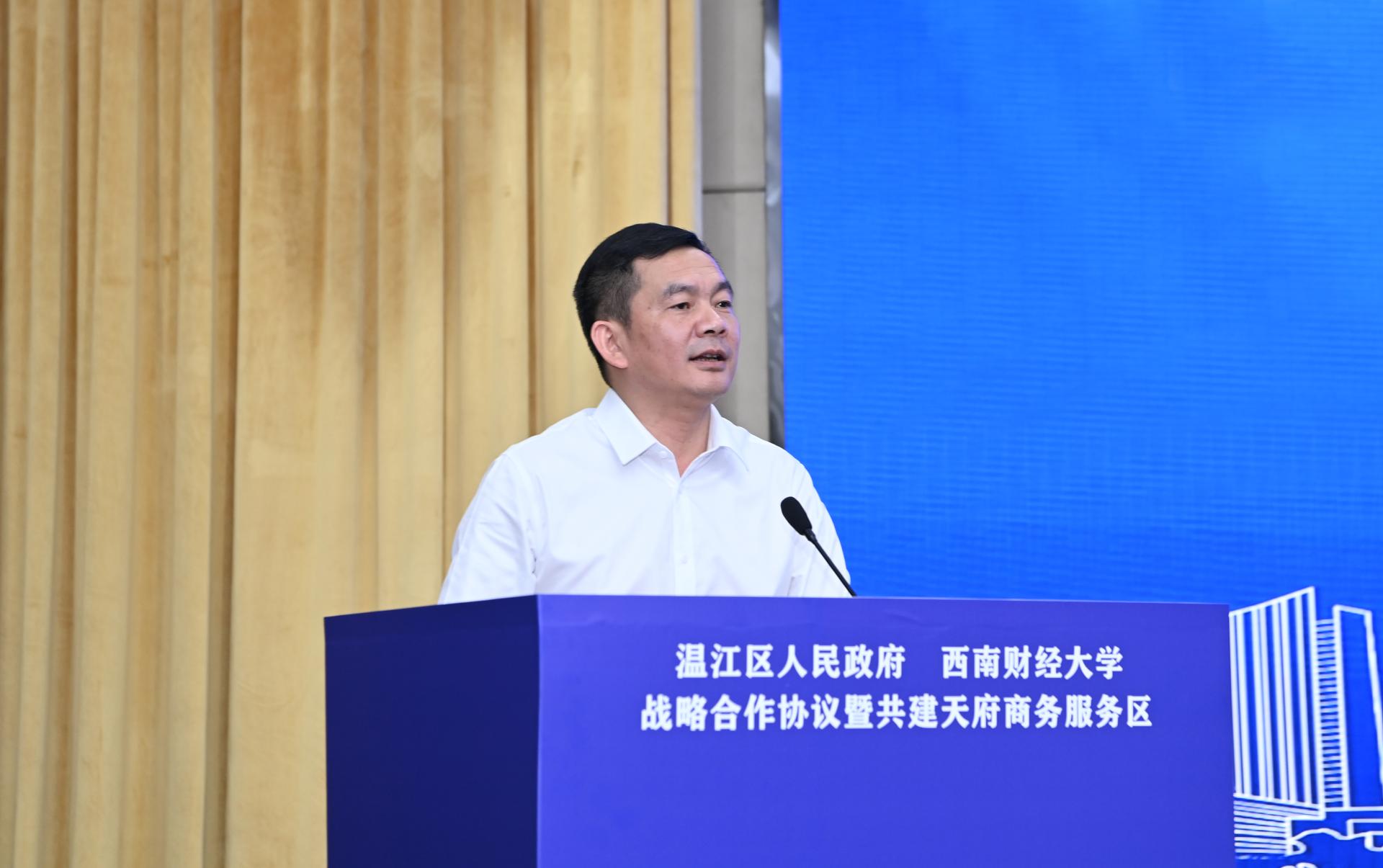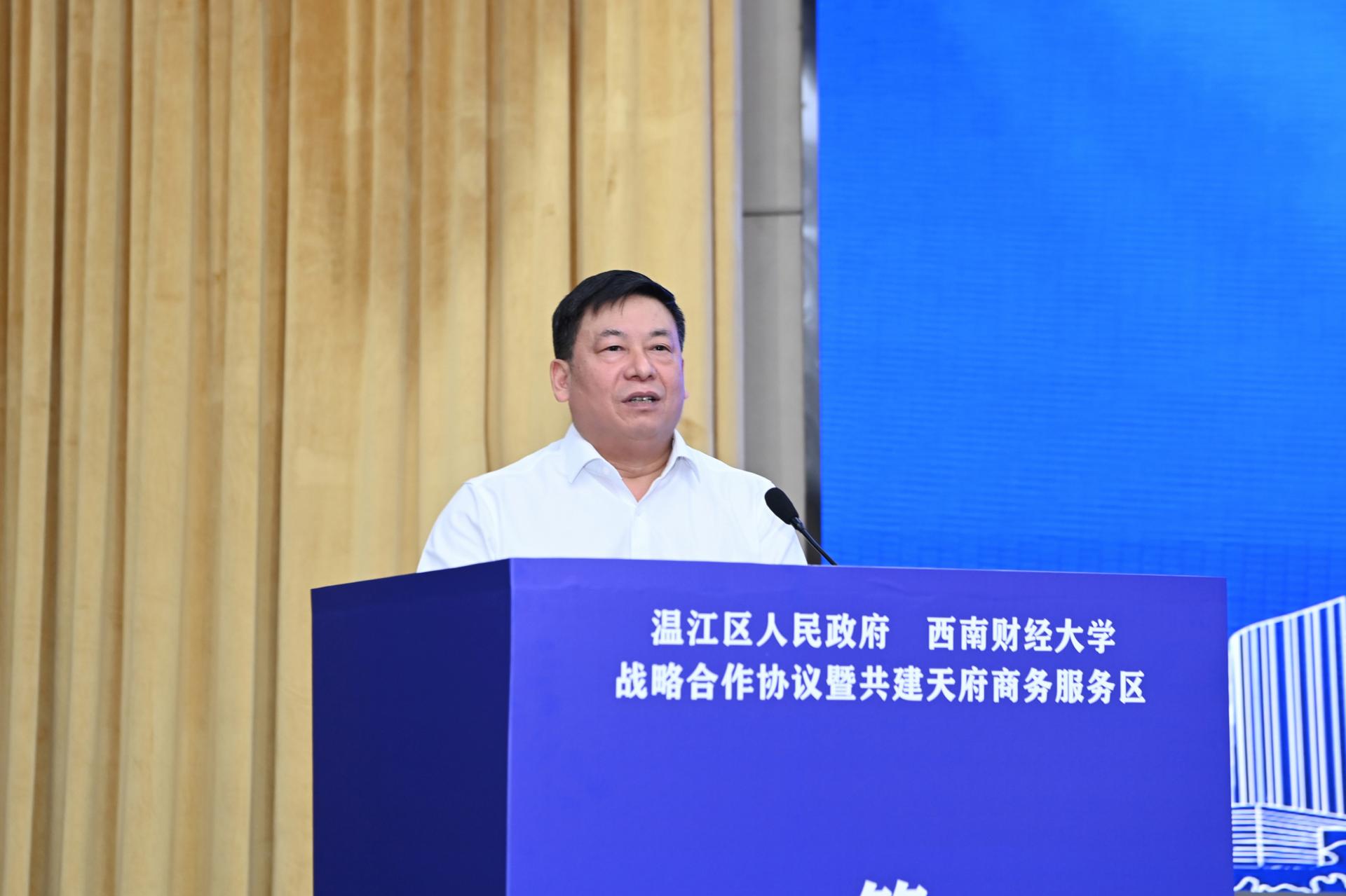趙德武在講話中表示西南財經大學扎根溫江20年,始終相融相依,攜手前行,長期以來雙方依托各自資源優勢,在戰略咨詢與決策、人才培養與交流、產教融合等領域取得了顯著成效。此次攜手共建天府商務服務區是學習貫徹習近平總書記來川視察重要指示精神和四川省第十二次黨代會精神的具體實踐,也是貫徹落實成都市第十四次黨代會關于建設環高校知識經濟圈的一致行動,必將成為溫江區和西南財經大學合作發展的重要里程碑,學校將認真履行協議約定的各項條款,為共建天府商務服務區創造良好的條件,推動雙方在共建共享中一起走向未來。
