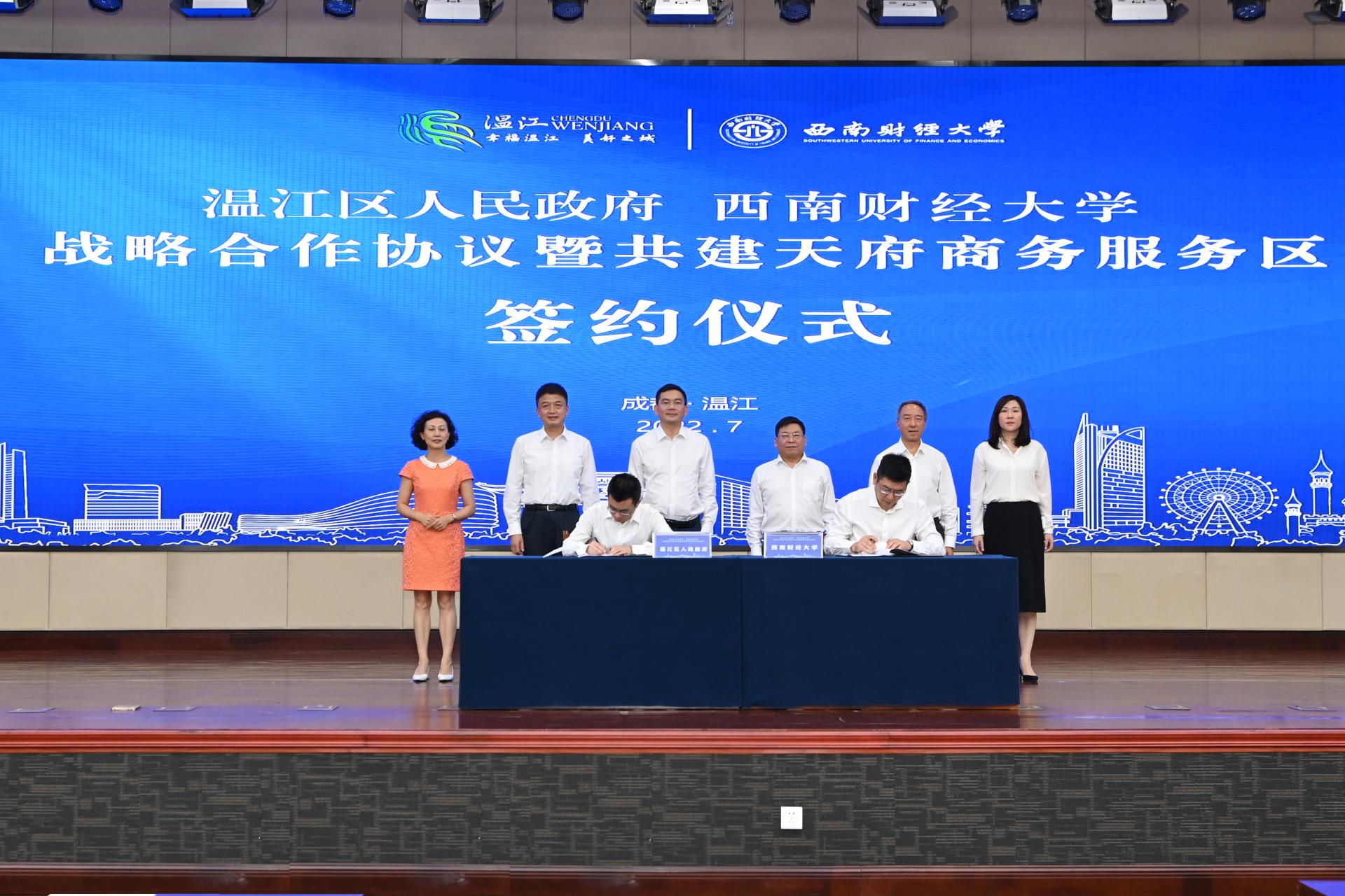 7月5日,我校與溫江區人民政府戰略合作協議暨共建天府商務服務區簽約儀式在溫江區政府舉行。溫江區委書記王乾,區委副書記、區長馬烈紅,區政協主席蔣莉,區委常委、常務副區長劉擁軍,區人大常委會副主任魏琳,副區長向彬;我校黨委書記趙德武,黨委副書記、校長卓志,黨委常委、副校長尹慶雙出席簽約儀式。