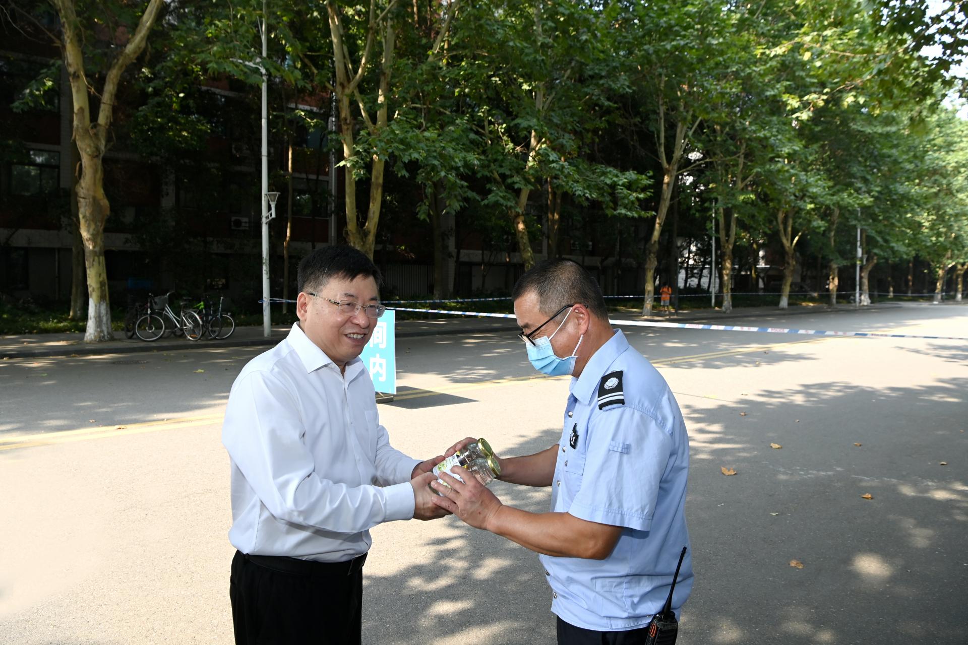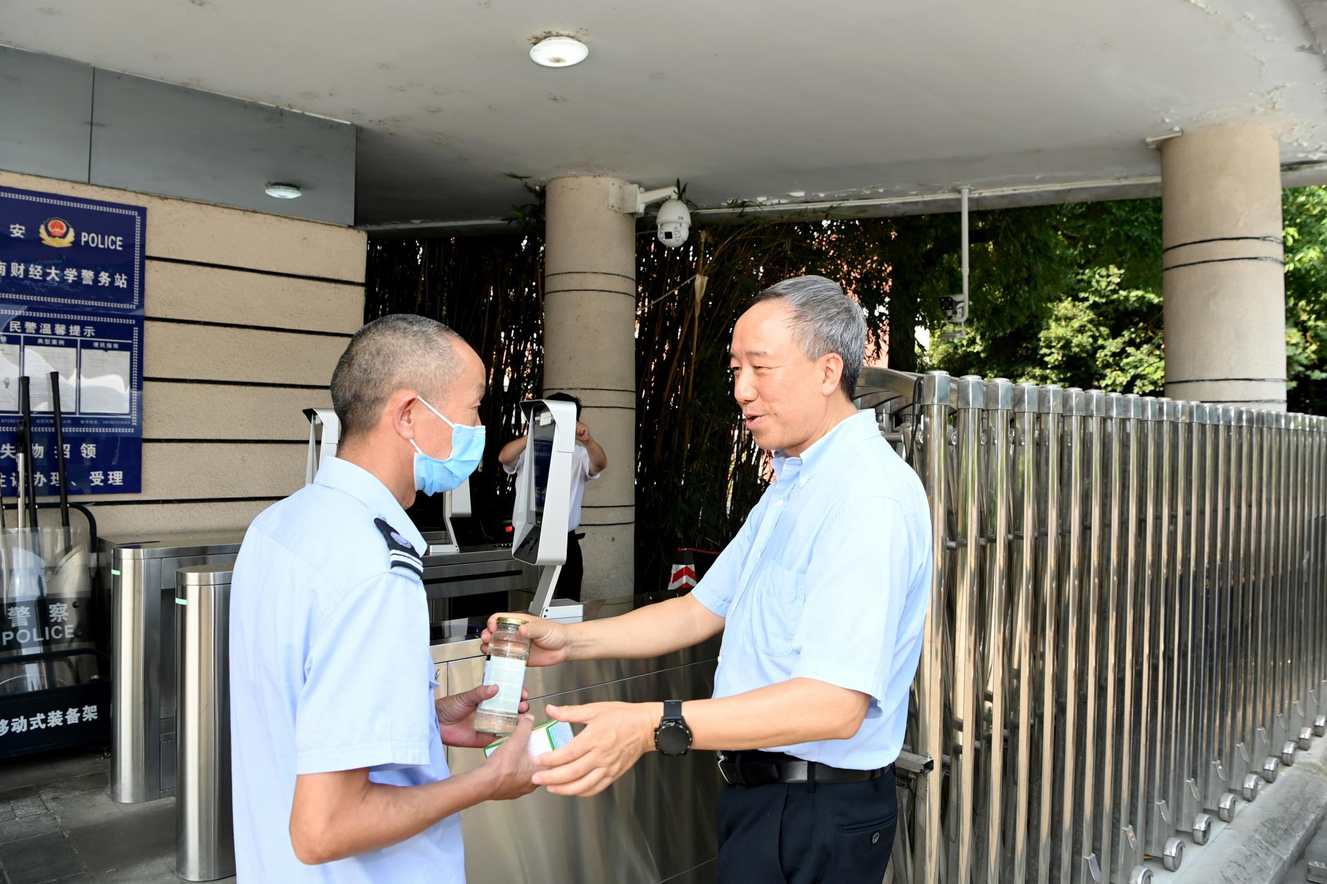 連日來成都酷暑難擋、驕陽似火。7月8日上午,黨委書記趙德武,黨委副書記、校長卓志,黨委副書記曾道榮一行先后來到學校門衛值班崗亭、校醫院和2021級本科學生軍訓現場,向克服高溫影響、堅守一線工作訓練的師生們致以親切的問候,并送上清涼解暑慰問品。