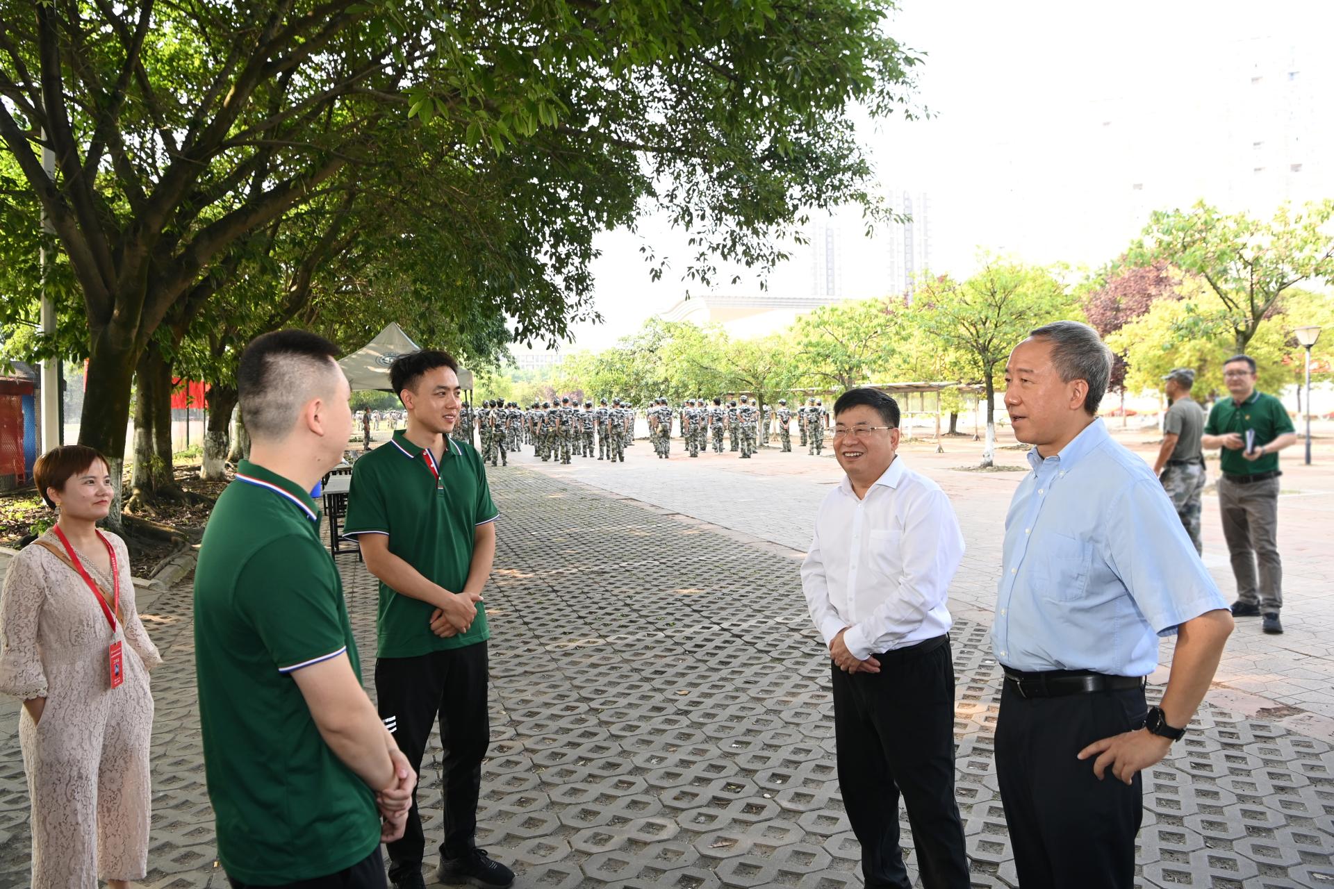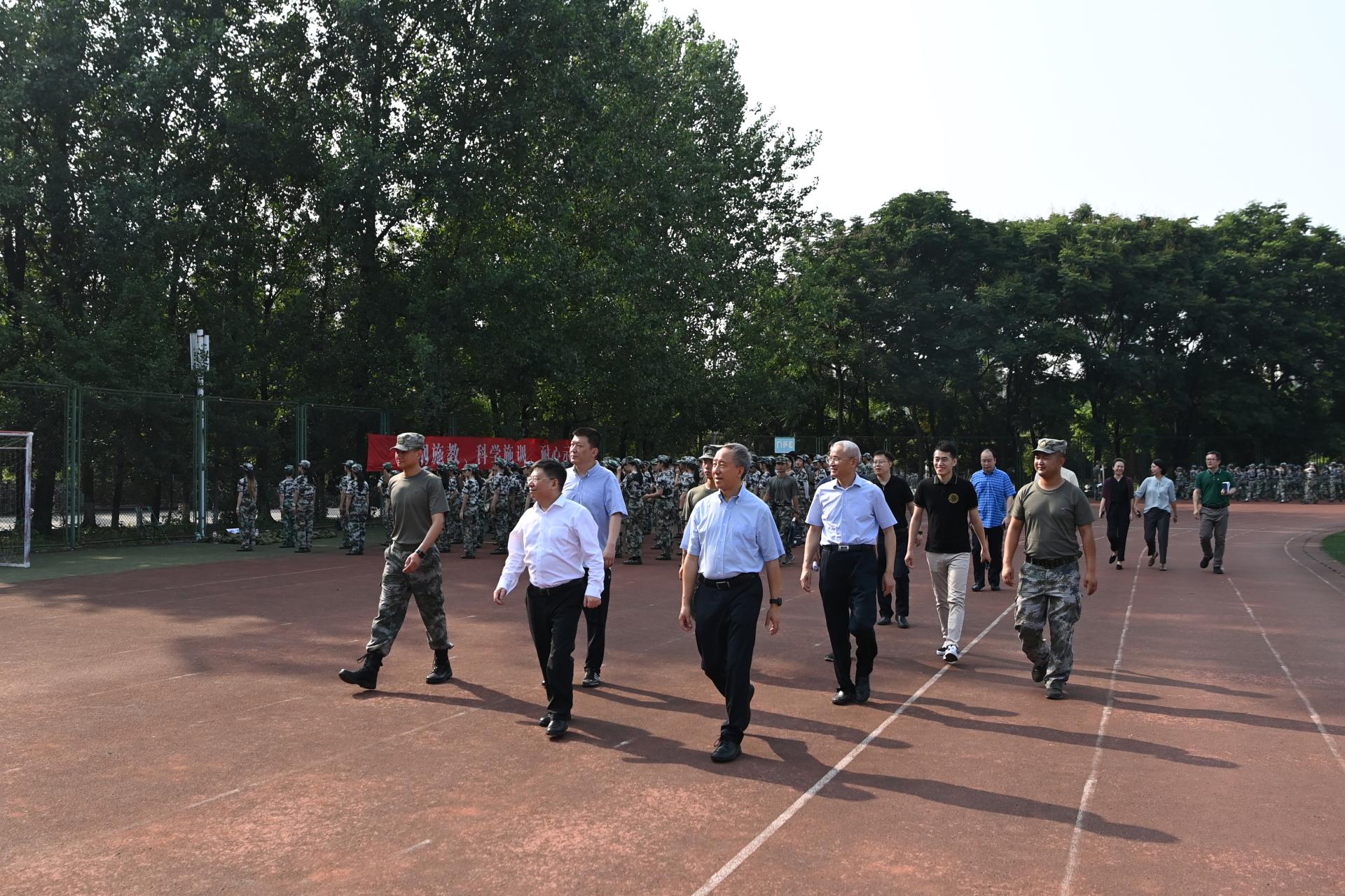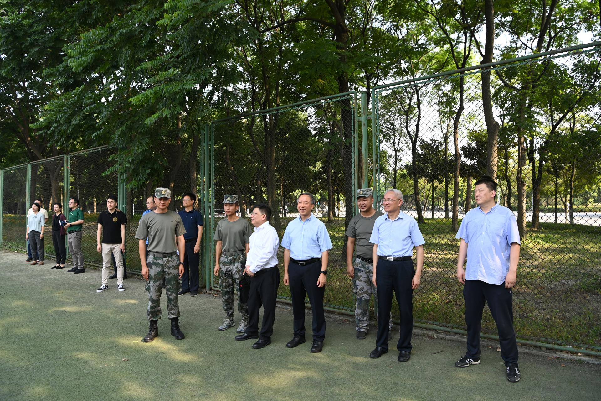 在2021級本科學生軍訓場地,校領導一行檢查了軍訓工作,看望慰問參訓學生、軍訓教官、帶隊輔導員及軍訓工作保障人員。他們對參訓學生的訓練精神和訓練狀態表示高度肯定,并對參訓學生、教官和相關工作人員在高溫天氣下認真堅持訓練、不折不扣完成軍訓任務表示親切慰問。他們要求,各相關部門要做好疫情防控及后勤服務保障工作,確保軍訓任務圓滿完成。