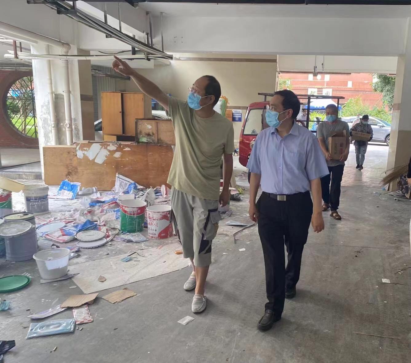 史代敏首先在光華校區(qū)校醫(yī)院主持召開防疫組、保障組校園疫情防控工作會,聽匯報、分析研判形勢、明確防控要求;隨后趕赴柳林校區(qū)深入到學(xué)生食堂、校醫(yī)院、學(xué)生公寓、教學(xué)樓等校園學(xué)習(xí)生活重點場所,詳細詢問了解暑期留校學(xué)生在用餐、住宿、看病就醫(yī)、學(xué)習(xí)等保障服務(wù)情況,殷殷囑托后勤要樹牢師生立場;深入詩白書院、畢業(yè)生寢室維修改造、信園自助洗衣房改造等施工現(xiàn)場檢查指導(dǎo),強調(diào)要統(tǒng)籌好建設(shè)與安全、品質(zhì)與進度。他向在暑期高溫天氣下堅守在工作崗位的工作人員表示誠摯慰問和感謝,并送上清涼解暑的慰問品。