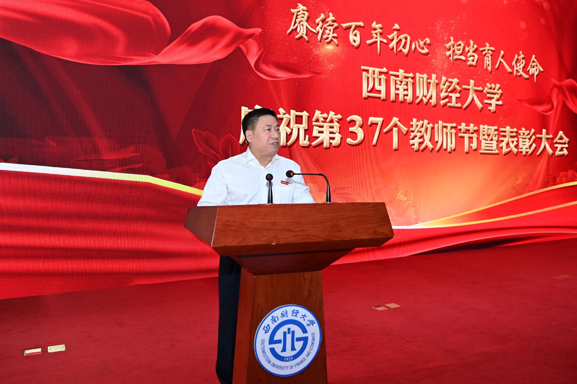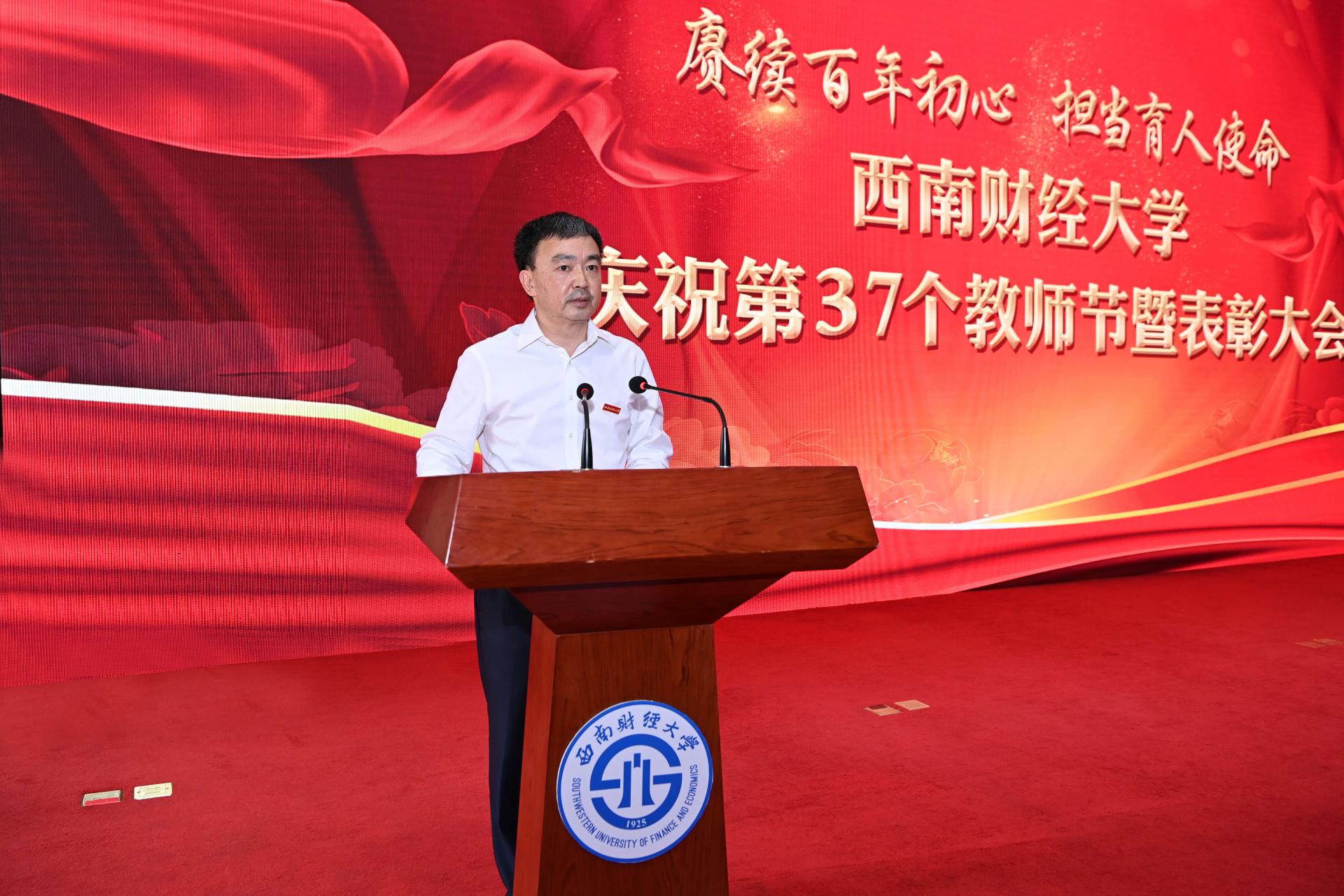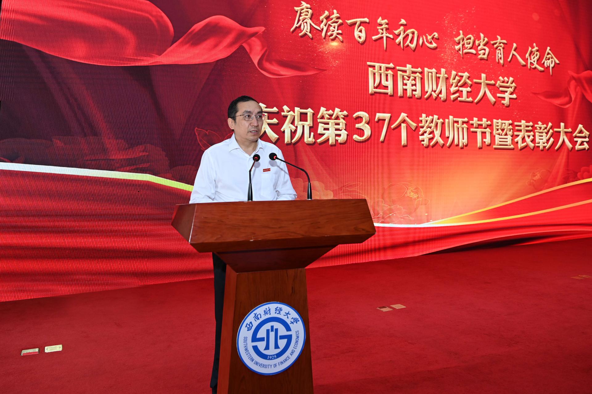 會(huì)上,學(xué)生代表李齊民宣讀賀信,感恩全體教師的辛勤付出,并獻(xiàn)上崇高敬意和誠(chéng)摯祝福,立志踐行請(qǐng)黨放心、強(qiáng)國(guó)有我的青春誓言,將“經(jīng)世濟(jì)民、孜孜以求”的西財(cái)精神播撒四方。