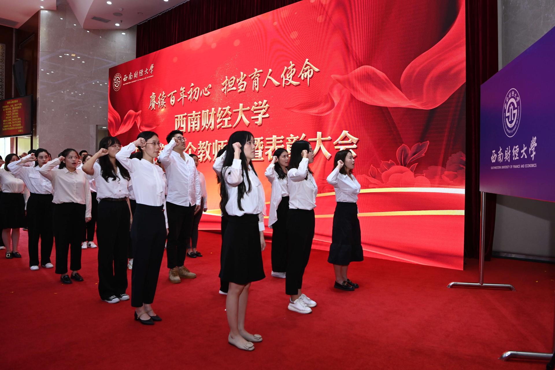 新進(jìn)教職工代表袁凱彬、李彥、羅謨諾、李茜以詩(shī)朗誦形式獻(xiàn)上深情告白,表示新一輩西財(cái)人將賡續(xù)百年初心,擔(dān)當(dāng)育人使命,讓紅色血脈生生不息、讓西財(cái)精神代代相傳。隨后,全體新進(jìn)教職工面對(duì)校旗莊嚴(yán)宣誓,將忠于教育事業(yè),履行教師職責(zé),弘揚(yáng)財(cái)經(jīng)文明,培育華夏棟梁,為實(shí)現(xiàn)中華民族的偉大復(fù)興而努力奮斗!