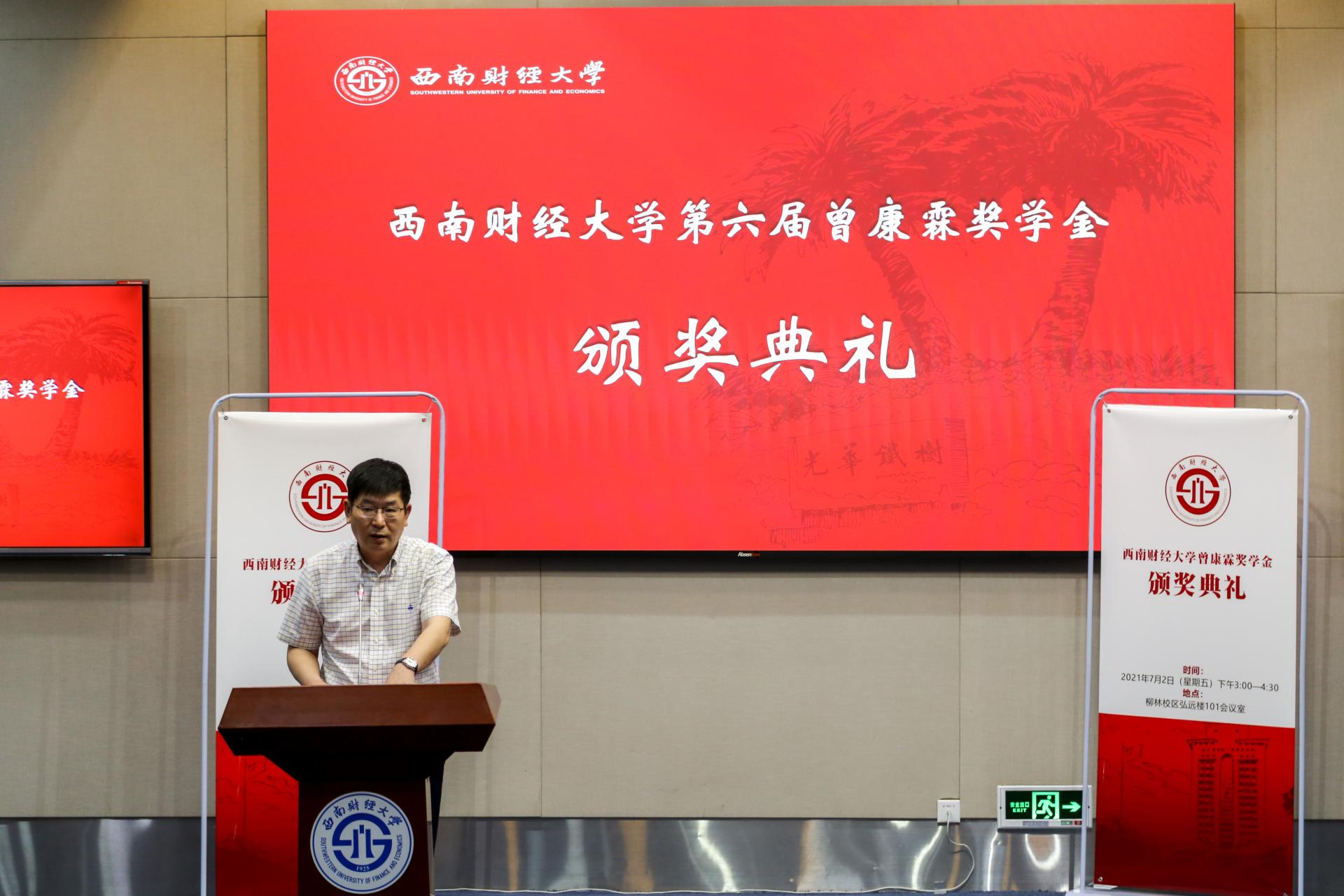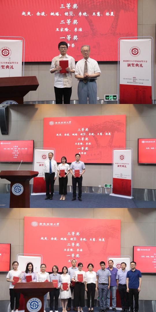 7月2日下午,西南財(cái)經(jīng)大學(xué)第六屆曾康霖獎(jiǎng)學(xué)金頒獎(jiǎng)典禮在弘遠(yuǎn)樓101會(huì)議室隆重舉行。著名金融學(xué)家曾康霖教授及夫人謝應(yīng)輝,黨委副書(shū)記、校長(zhǎng)卓志,黨委常委、副校長(zhǎng)尹慶雙,各學(xué)院(中心)負(fù)責(zé)人、獲獎(jiǎng)學(xué)生和導(dǎo)師代表參加典禮。尹慶雙主持典禮。