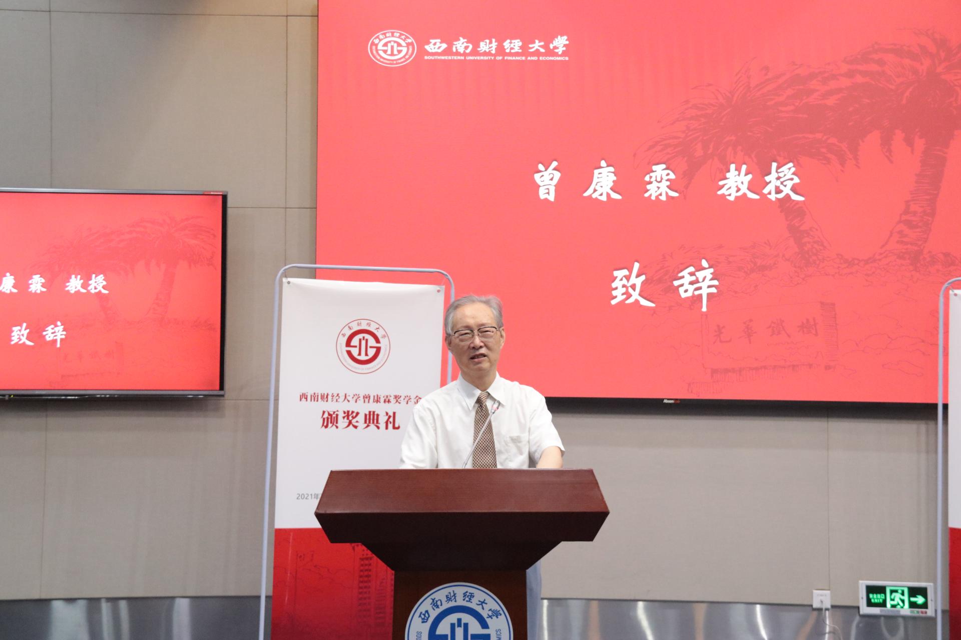 卓志發(fā)表致辭,代表學(xué)校向曾康霖教授致以誠(chéng)摯感謝和崇高敬意,向獲獎(jiǎng)同學(xué)表示衷心祝賀。他充分贊揚(yáng)了曾康霖教授在中國(guó)金融學(xué)科建設(shè)和我校金融學(xué)科建設(shè)中做出的卓越貢獻(xiàn),并對(duì)先生畢生為金融教育事業(yè)奉獻(xiàn)表達(dá)由衷敬意。他表示,曾康霖教授作為金融教育事業(yè)的耕耘者,言傳身教、誨人不倦,培養(yǎng)出大批國(guó)家棟梁之才,其學(xué)養(yǎng)、建樹(shù)和品格備受學(xué)界業(yè)界及廣大學(xué)生的敬仰。卓志希望獲獎(jiǎng)的同學(xué)愛(ài)黨愛(ài)國(guó),終身實(shí)干,在貢獻(xiàn)家國(guó)中成就大我,不馳于空想、不騖于虛聲,學(xué)習(xí)新知識(shí)、研究真學(xué)問(wèn)、解決真問(wèn)題,在融會(huì)貫通中創(chuàng)新突破。