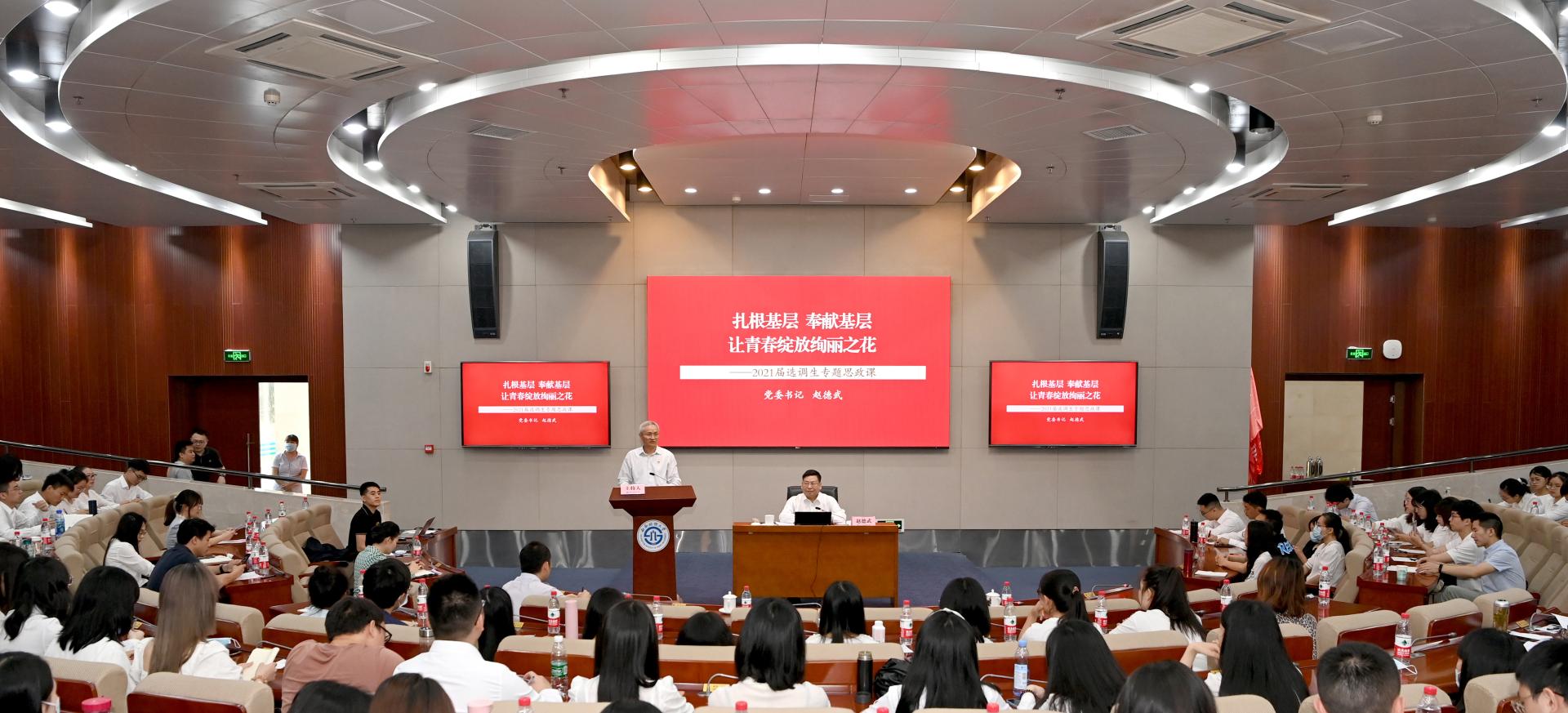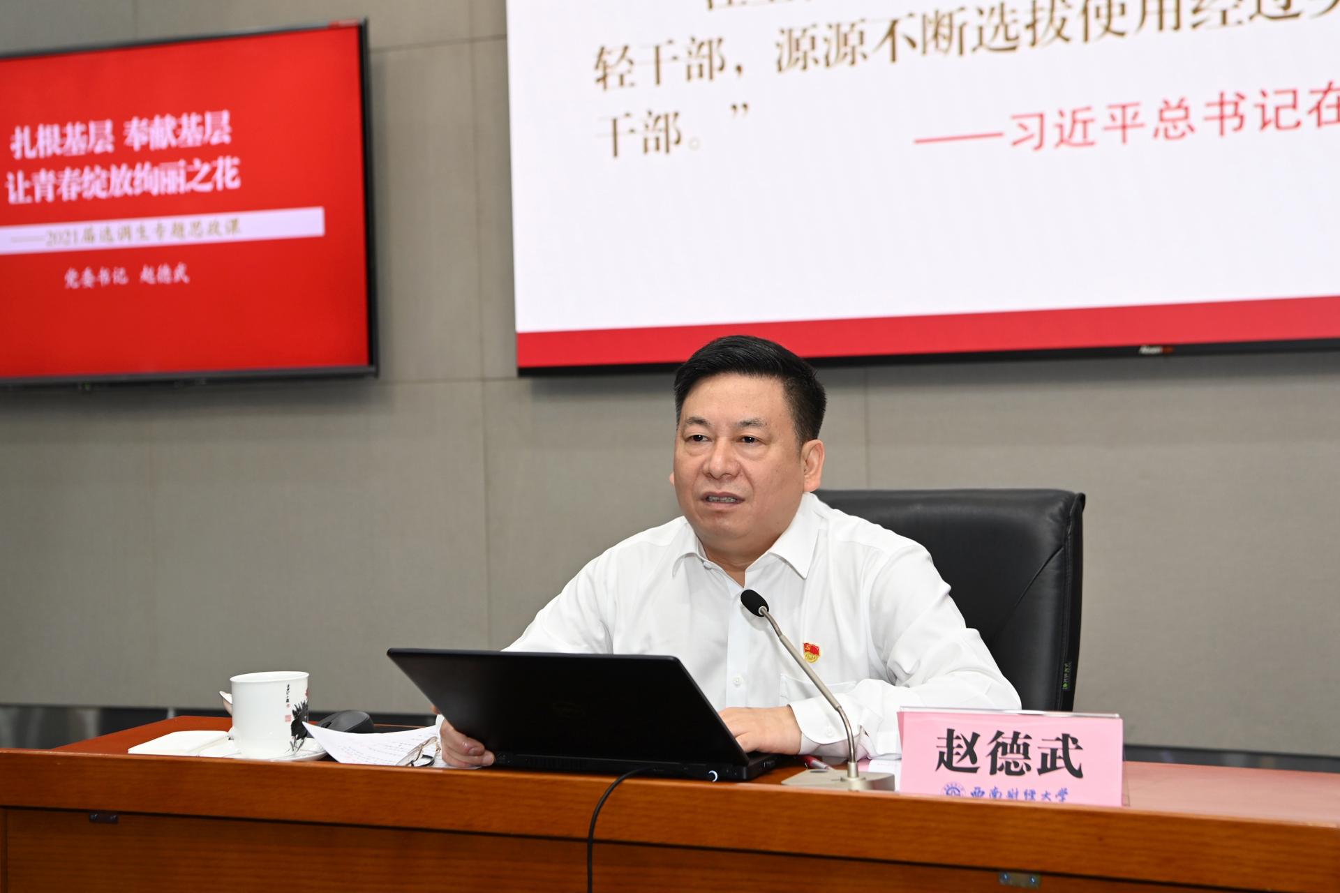 趙德武書記以《扎根基層、奉獻基層,讓青春綻放絢麗之花》為題為全體選調生講專題思政課。趙德武充分肯定了學校近年來基層就業工作的成績和選調生同學報效祖國的遠大志向。結合習近平總書記成長經歷和有關重要講話精神,他深入講解了我國選調生制度的發展歷程和大學生扎根基層歷練的重要意義,結合“好干部”標準和“五個過硬”要求,系統闡述了新時代年輕干部應當具備哪些能力,并向臨行之前的選調生同學寄予了殷切期望,即堅持信念上永不動搖、精神上永不懈怠、心態上永不急躁、工作上永不滿足、學習上永不松勁、處事上永不自負、廉潔上永不越線,努力成為黨和國家事業發展需要的優秀人才,為實現中華民族偉大復興的中國夢貢獻西財力量。