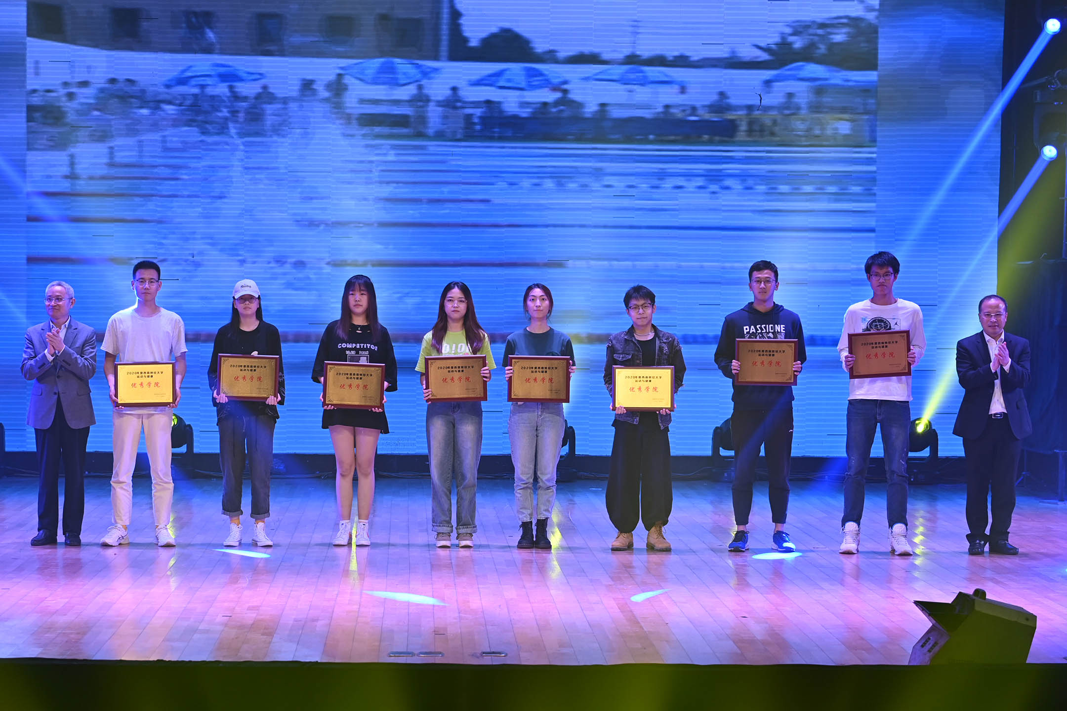 晚會(huì)為大家呈現(xiàn)了一臺(tái)健康活力的視聽盛宴,學(xué)校領(lǐng)導(dǎo)、職能部門及學(xué)院(中心)負(fù)責(zé)人為獲獎(jiǎng)單位和個(gè)人頒獎(jiǎng),校領(lǐng)導(dǎo)還走向觀眾席與師生互動(dòng),送出大量健身器材,鼓勵(lì)正當(dāng)青春的同學(xué)們積極參加體育鍛煉,在運(yùn)動(dòng)中燃燒激情、在陽(yáng)光下綻放青春。