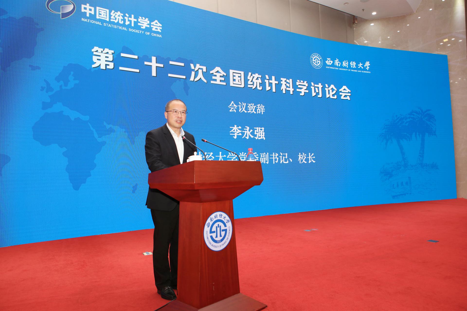 李永強致辭,代表會議承辦方西南財經(jīng)大學(xué)熱烈歡迎與會嘉賓的到來,他結(jié)合學(xué)校與國家需求、時代脈搏同頻共振的發(fā)展歷程,重點介紹了近年來深入推進“建設(shè)新文科、引領(lǐng)新財經(jīng)、創(chuàng)造新優(yōu)勢”戰(zhàn)略實踐,全面推動“新財經(jīng)”戰(zhàn)略升級的戰(zhàn)略考量、總體部署與實踐成果,他指出學(xué)校緊扣統(tǒng)計學(xué)科發(fā)展前沿和重大需求,形成了以數(shù)理統(tǒng)計為基礎(chǔ)、經(jīng)濟統(tǒng)計為重點、數(shù)據(jù)科學(xué)為引擎、彰顯金融統(tǒng)計優(yōu)勢的學(xué)科發(fā)展格局,統(tǒng)計學(xué)科實力與服務(wù)國家經(jīng)濟社會發(fā)展的能力不斷提升。他表示全國統(tǒng)計科學(xué)討論會是國內(nèi)統(tǒng)計學(xué)者及工作者思想交流、智慧交融的重要平臺,期待與會專家在交流研討中展現(xiàn)我國統(tǒng)計學(xué)界的最新理論研究成果和實踐經(jīng)驗。服務(wù)中國式現(xiàn)代化是統(tǒng)計的職責(zé)所系,西南財經(jīng)大學(xué)期待與統(tǒng)計政產(chǎn)學(xué)研各界同題共答,為服務(wù)“國之大者”貢獻統(tǒng)計之力,以“強國建設(shè)、統(tǒng)計有為”的使命擔當服務(wù)中國式現(xiàn)代化。