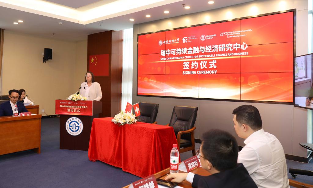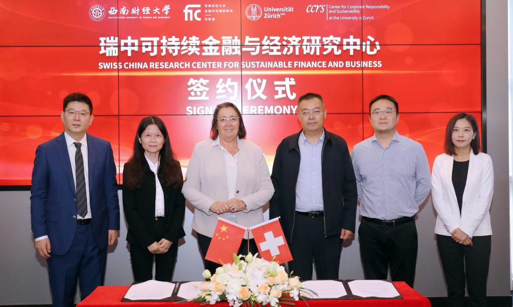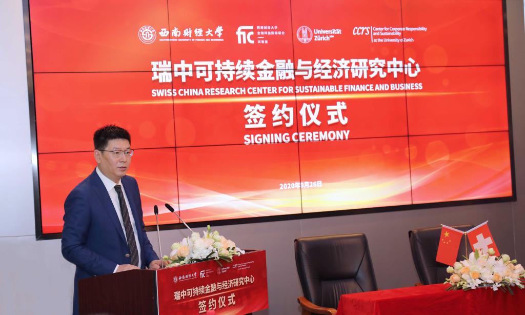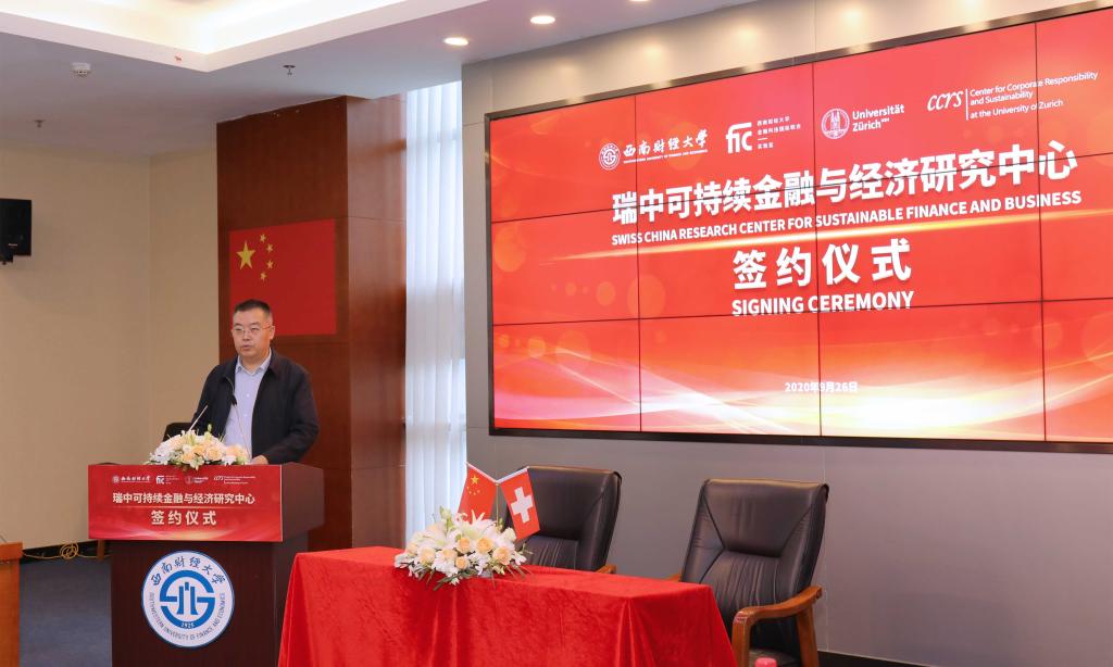 9月26日下午,瑞中可持續金融與經濟研究中心簽約儀式和ESG新財經研討會在我校弘遠樓舉行。成都市地方金融監督管理局黨組書記、局長梁其洲,瑞士駐成都領事館總領事高凱琳,蘇黎世大學企業可持續發展與責任研究院院長菲利普·阿爾尼,國內外金融機構、科研業界機構代表,我校黨委常委、副校長尹慶雙和金融學院負責人出席儀式。