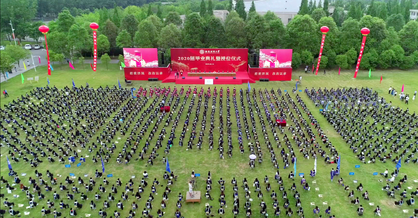 6月10日清晨,南草坪上芳草如茵、彩旗飛舞,學(xué)校以“草坪典禮+線上直播”的方式為6000余名畢業(yè)學(xué)子送上了別樣的畢業(yè)典禮。黨委書記趙德武,校長(zhǎng)、黨委副書記卓志,黨委常委、常務(wù)副校長(zhǎng)彭龍,黨委副書記馬驍,黨委副書記曾道榮,黨委常委、副校長(zhǎng)歐兵、尹慶雙、史代敏、張邦富、李永強(qiáng),各學(xué)院(中心)和有關(guān)職能教輔部門負(fù)責(zé)人、教師代表和近2000名身著學(xué)位服的畢業(yè)生代表在現(xiàn)場(chǎng)參加了畢業(yè)典禮暨授位儀式,4000余名學(xué)子在各自的宿舍或五湖四海的家中,通過(guò)線上直播共享了“云典禮”,共同銘記人生的珍貴時(shí)刻。趙德武主持畢業(yè)典禮,卓志在畢業(yè)典禮上講話。
