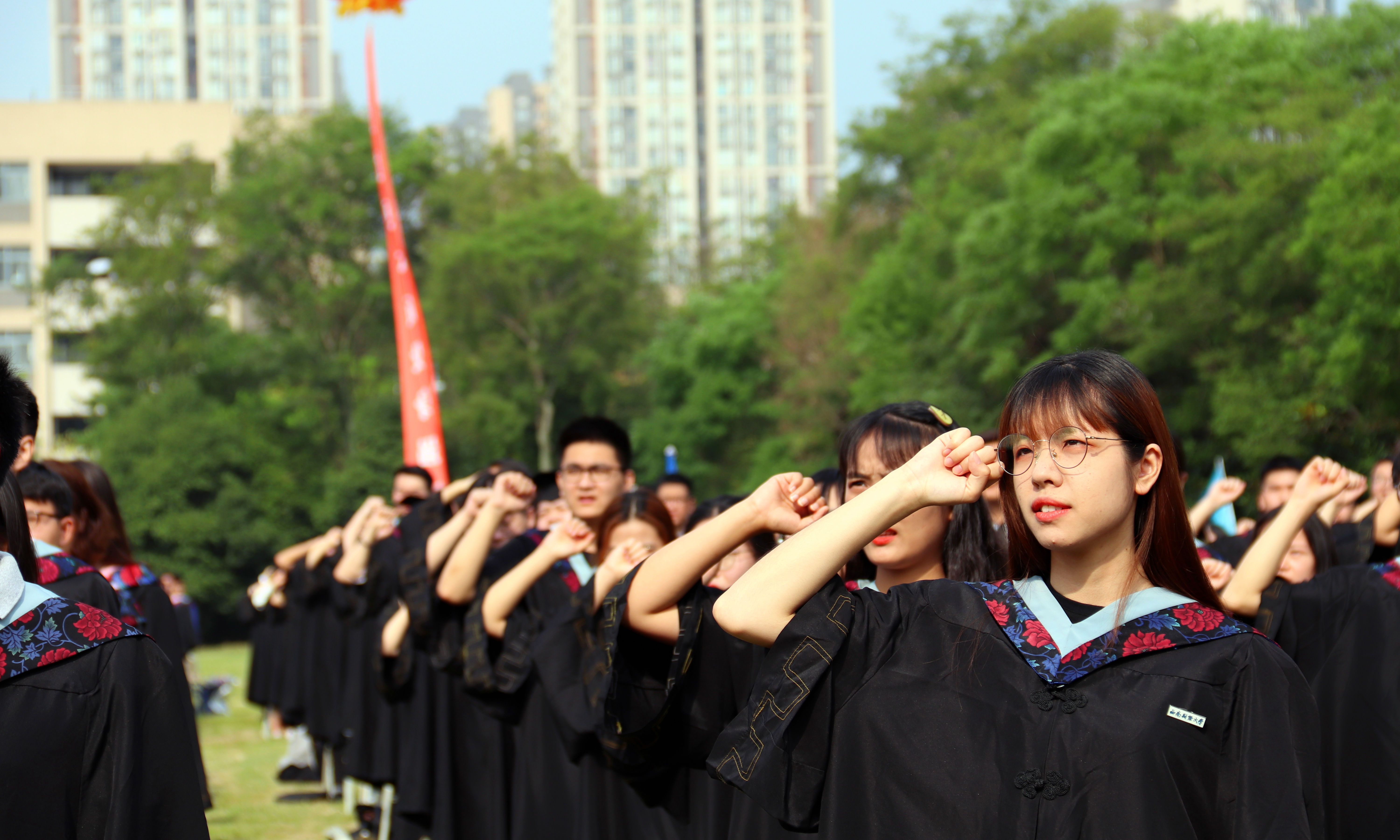 全場(chǎng)畢業(yè)生高舉右拳齊聲宣誓:將傳承西財(cái)精神,發(fā)揚(yáng)西財(cái)校訓(xùn),不忘初心,捍衛(wèi)真理,不懼風(fēng)雨,勇挑重?fù)?dān),讓青春在黨和人民需要的地方綻放,為中華民族偉大復(fù)興和人類文明共同進(jìn)步貢獻(xiàn)力量。