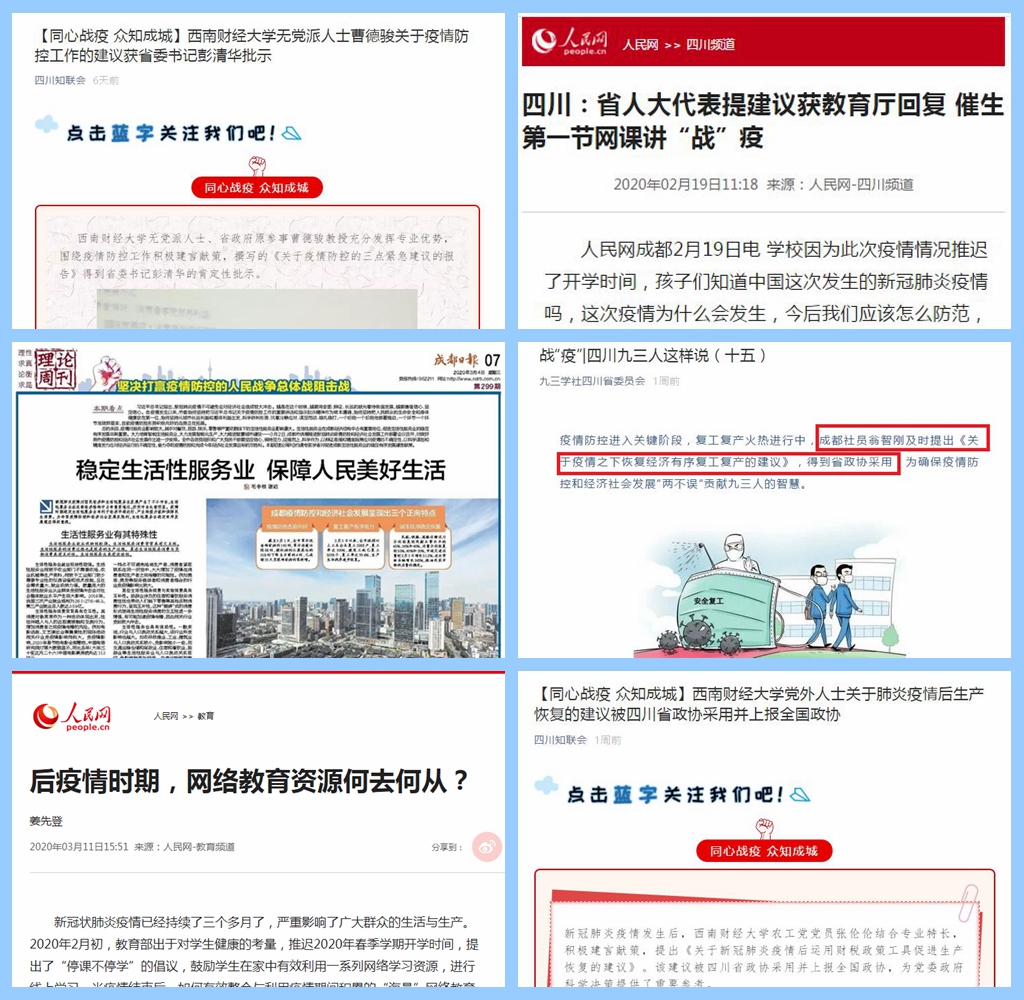 高質量的緊急建言、社情民意一篇接著一篇,西南財大統一戰線成員發揮專業優勢積極獻策,把研究成果和資政建議寫在抗擊疫情的第一線。