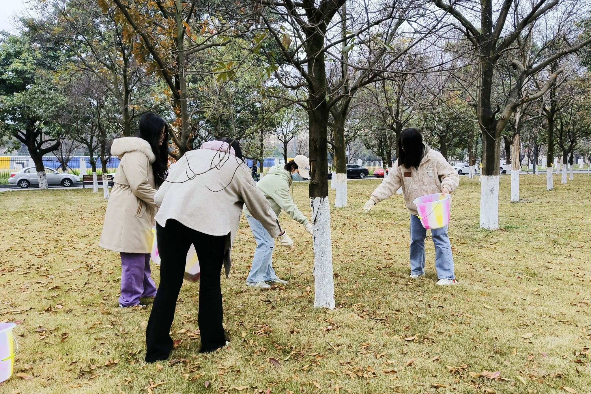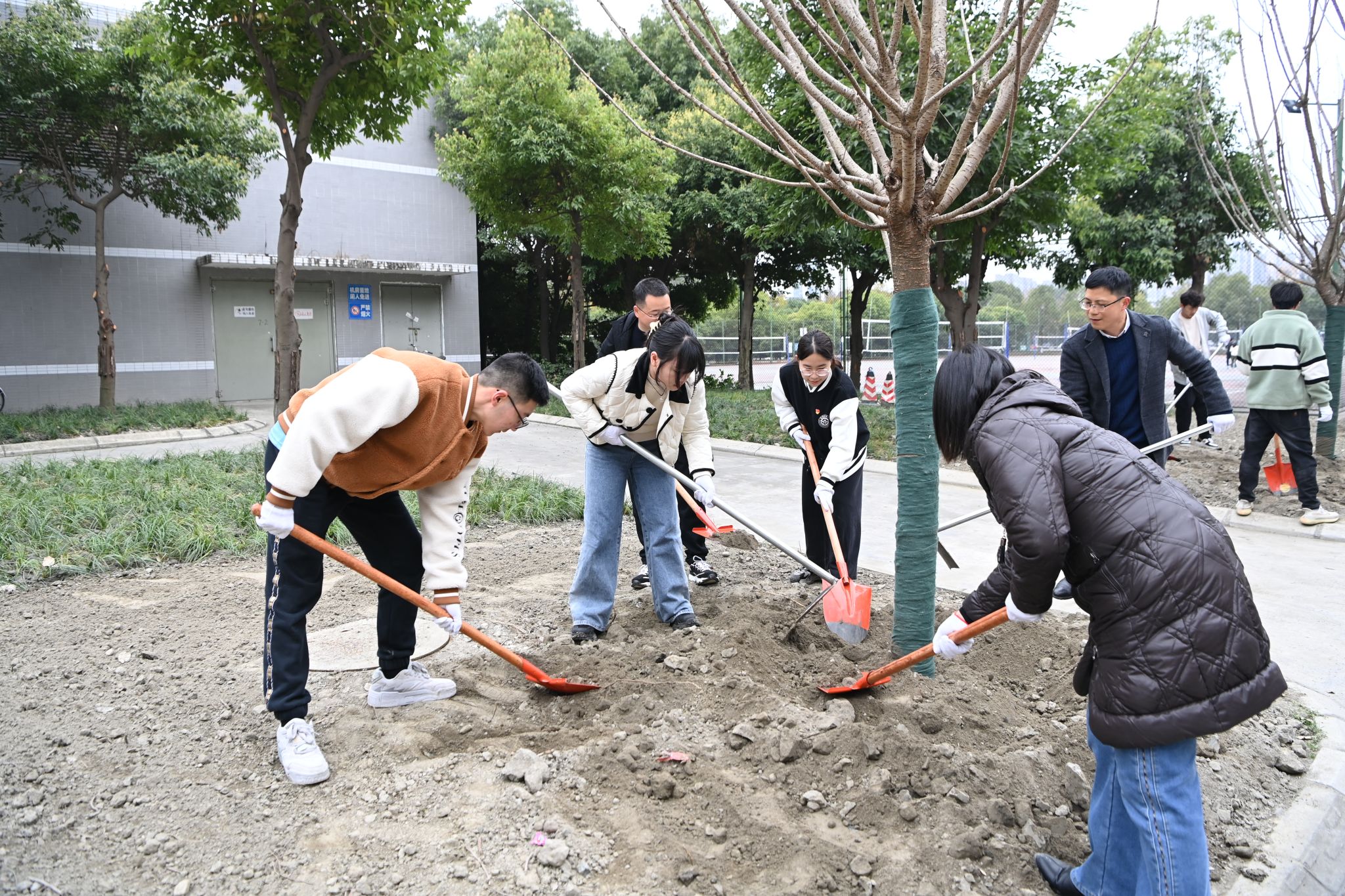 下午兩點,植樹護樹活動在兩校區同時舉行。柳林校區詩白書院南側,師生們三五人一組,團結協作干勁十足,揮舞鐵鍬、鏟土挖坑、踏土夯實、覆土平整……勞動現場有條不紊,各個環節銜接有序。經過師生近一個小時的辛勤勞作,88株重瓣晚櫻迎風而立,為美麗校園增添了一道生機盎然的風景線。光華校區光華樓西側草坪,師生們擼起袖子拎起水桶,認真細致地為每一株樹木施肥澆水,一株株銀杏、杜英、玉蘭在和煦春風中享受涓涓清流的澆灌,煥發出勃勃生機。