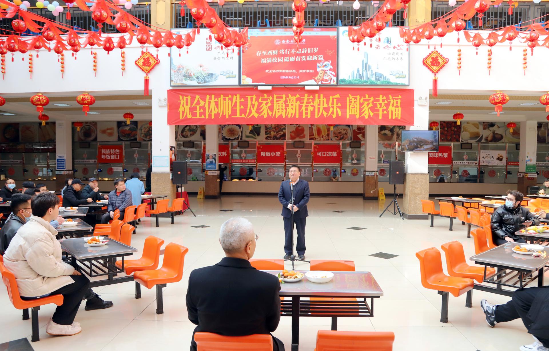 趙德武向留校同學致以新春的問候和美好祝福,向節假日期間堅守崗位、辛勤工作的教職工和保衛、后勤工作人員表示衷心的感謝和良好的祝愿!他與現場領導和老師們同留校同學們一起猜燈謎、聊家常、談學習,與陜西、河南、天津等地因疫情留校的同學、新疆少數民族同學和留學生們親切交流,希望同學們假期多和家里聯系并帶去節日祝福,同時做好個人防護,珍惜學習時光,加強體育鍛煉,度過一個溫暖充實而有意義的假期。