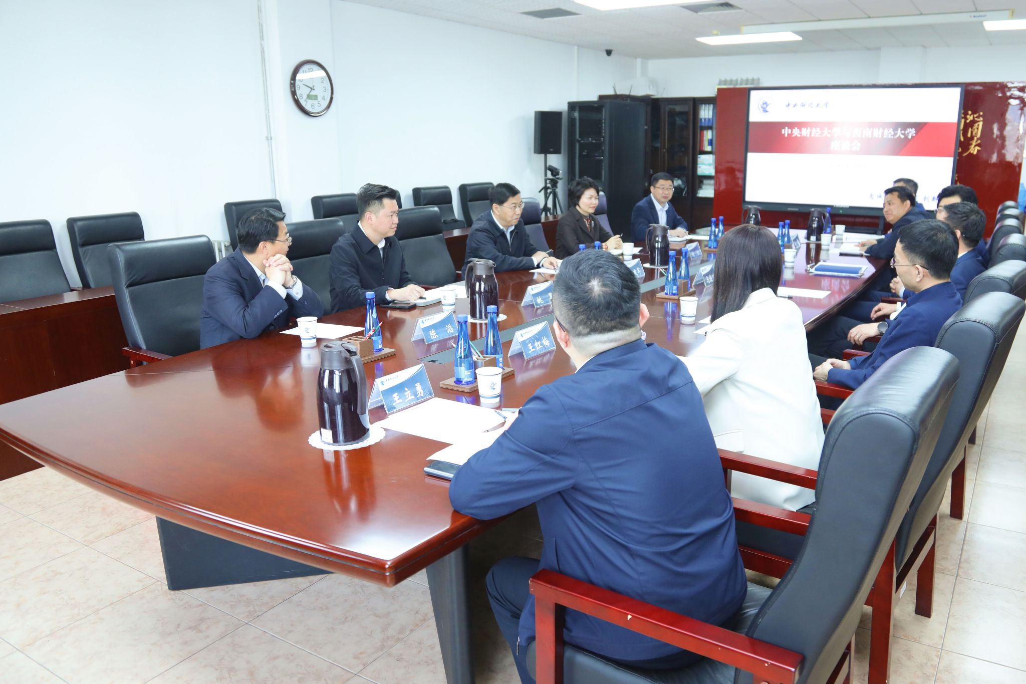 在中央財經大學交流時,馬海濤從人才培養、學科建設、科學研究、師資隊伍建設等方面介紹了中央財經大學近年來的發展情況。他表示,長期以來,兩校保持良好的溝通聯系,是親密的合作伙伴,今后,期待雙方在前期友好合作的基礎上,立足兩校“雙一流”建設發展需求,進一步加強交流、深化合作,充分發揮財經類高校優勢,共同開創財經類高校合作共贏新局面。趙建軍詳細介紹了我校在學科建設、人才隊伍建設、立德樹人等方面的基本情況。他表示,中央財經大學與西南財經大學有著相類似的學科背景,近年來,兩校交往密切、溝通順暢。今后,希望兩校能進一步加強溝通交流,不斷拓展工作思路、拓寬合作領域,互惠互利,共贏發展。