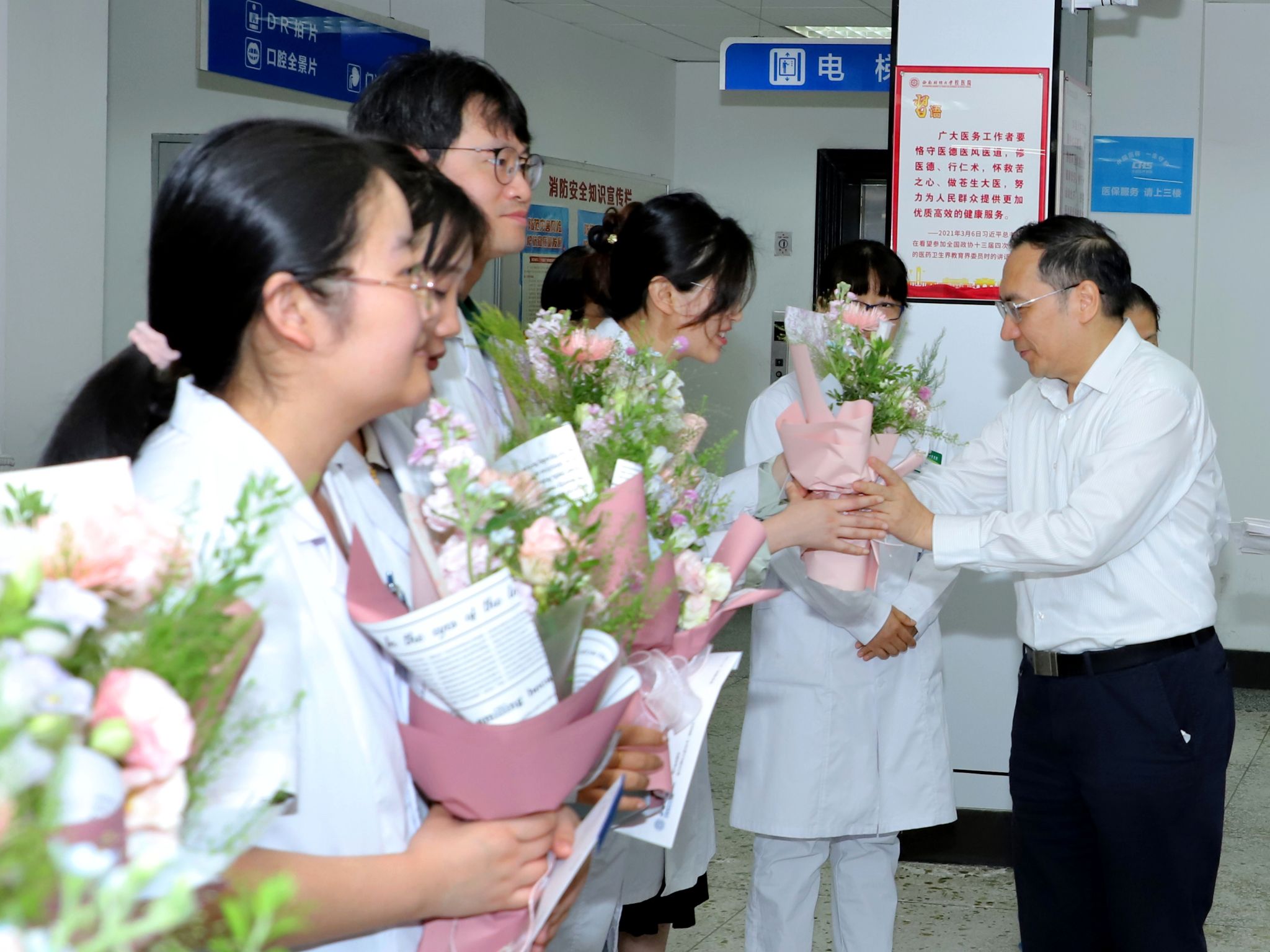 在113個國際護士節即將到來之際,5月10日,受黨委書記趙建軍和黨委副書記、校長李永強委托,黨委常委、副校長史代敏前往兩校區校醫院親切慰問一線醫護人員。校工會、后勤服務總公司負責人陪同慰問。