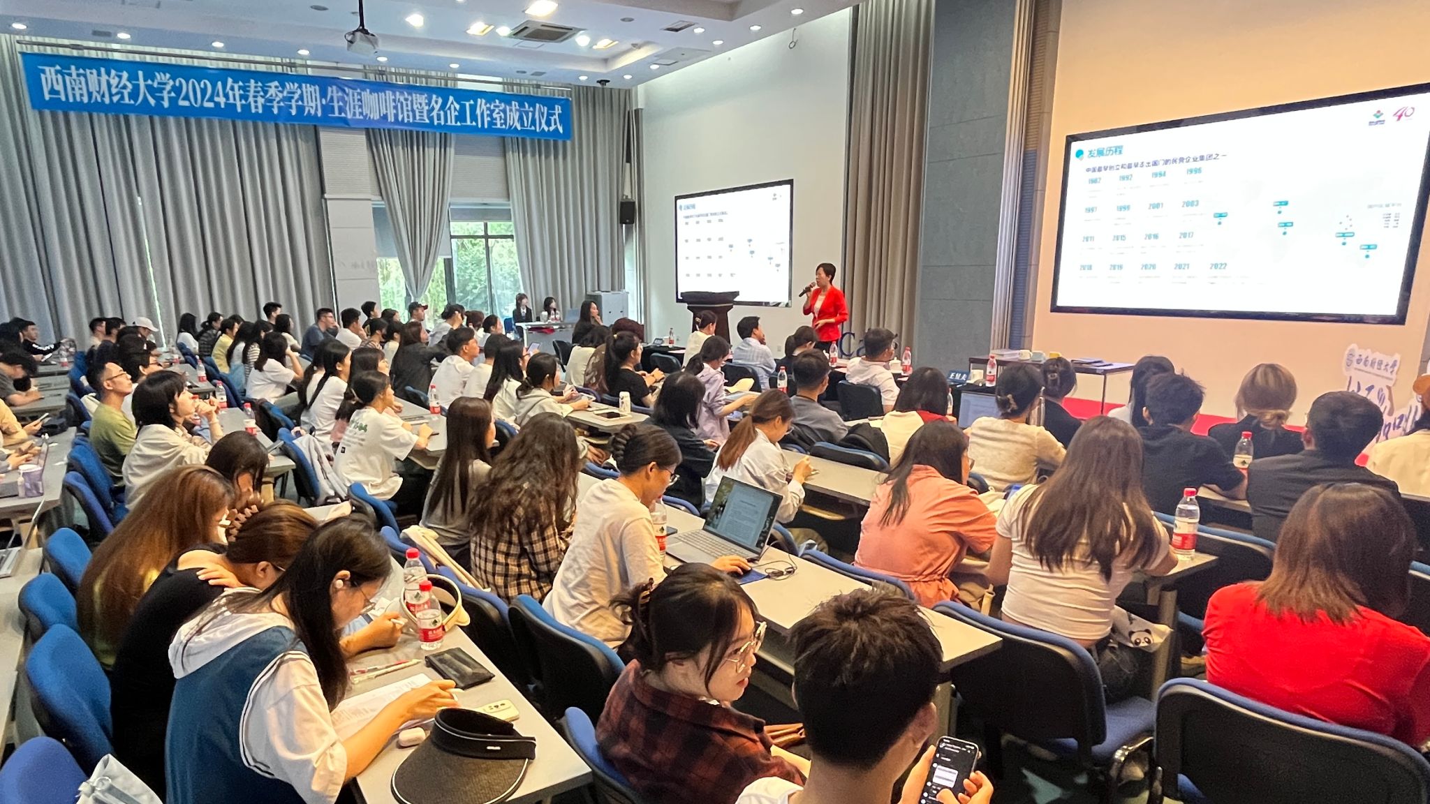 李永強和李建雄共同為“新希望集團工作室”揭牌。會前,楊芳、胡勁松出席了“生涯咖啡館”活動,與同學們進行交流分享。