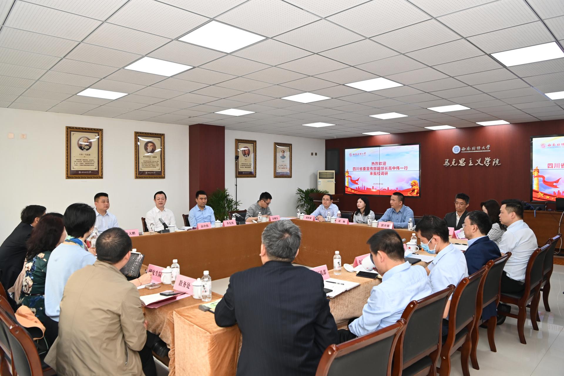 座談會上,馬驍簡要介紹了學校黨委深入貫徹習近平總書記系列重要講話精神的具體實踐,以及學校黨委大力加強馬克思主義學院建設的戰略考量、著力重點和馬克思主義學院入選四川省重點馬院以來取得的成效,希望省委宣傳部、省教育廳一如既往地給予學校和馬克思主義學院建設更多指導和更大支持。