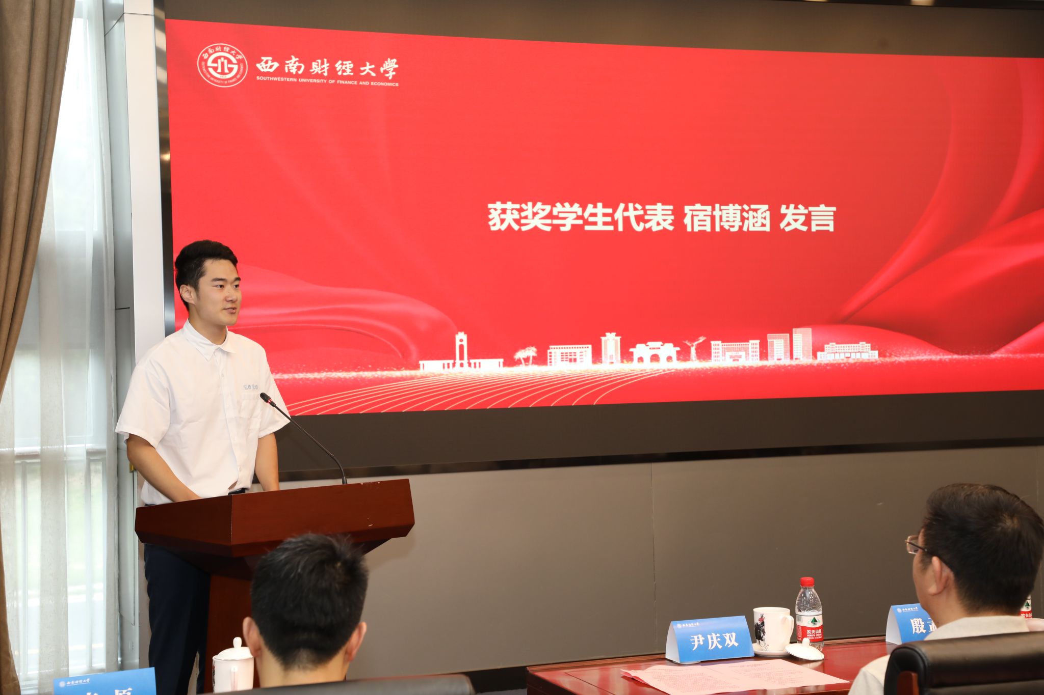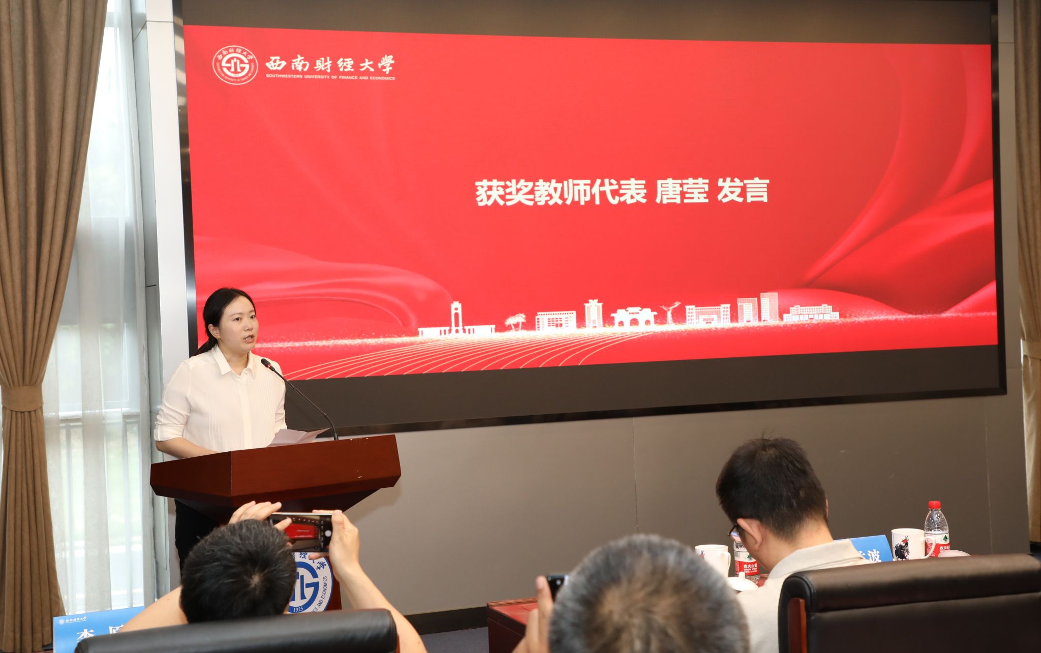 獲獎教師代表唐瑩在發(fā)言中表示將始終保持堅韌不拔的探索精神,站穩(wěn)講臺、深耕教學(xué),以身作則,用心指導(dǎo)和培養(yǎng)學(xué)生。獲獎學(xué)生代表宿博涵在發(fā)言中表示將持續(xù)弘揚“經(jīng)世濟(jì)民、孜孜以求”的西財精神,打好基礎(chǔ),深耕學(xué)術(shù),講好西財故事,不辜負(fù)母校栽培。