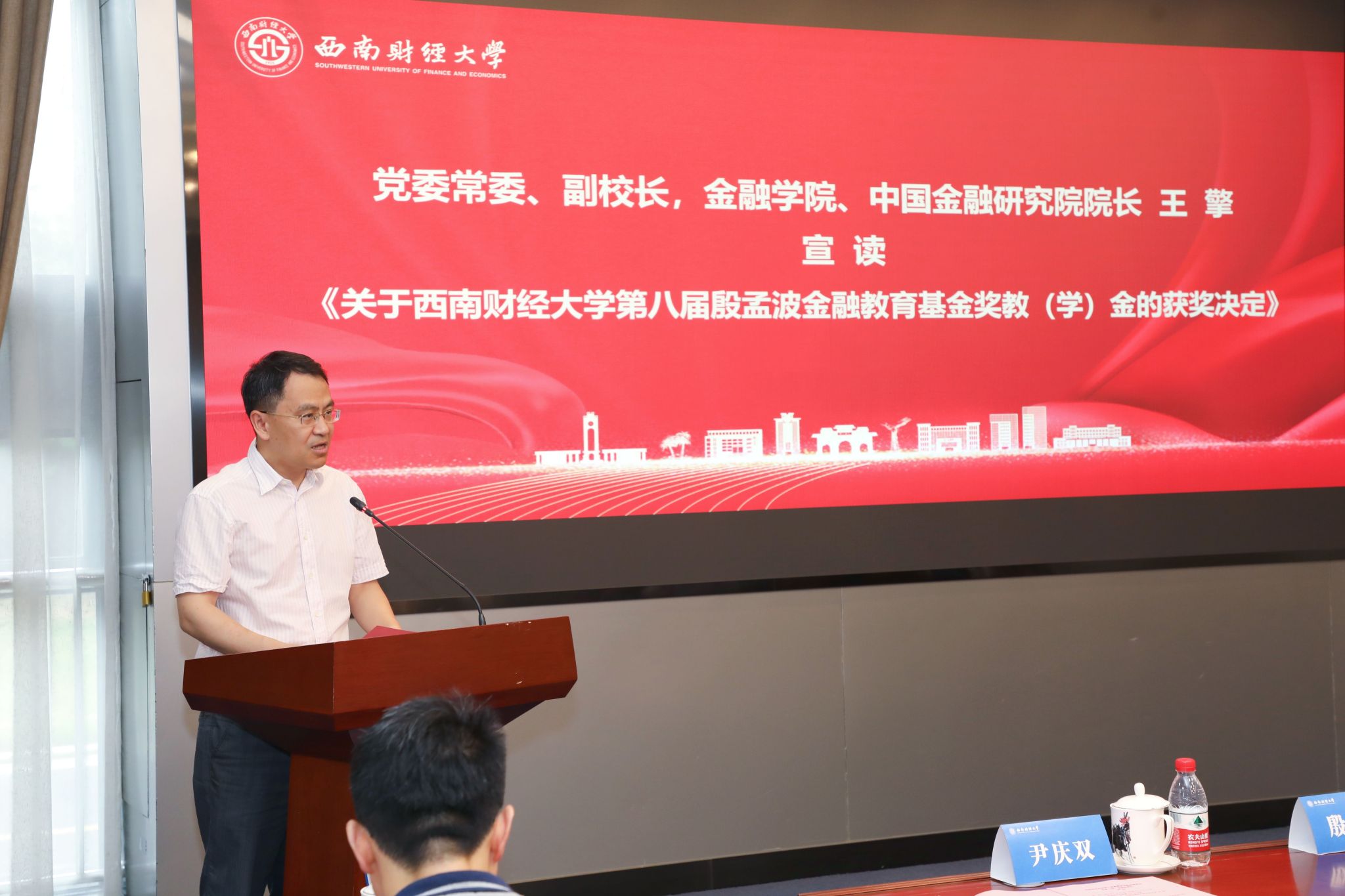 尹慶雙在致辭中對殷孟波教授為金融教育事業(yè)做出的卓越貢獻(xiàn)和無私奉獻(xiàn)表示感謝。他表示,榮獲“殷孟波金融教育基金獎教(學(xué))金”是一份榮譽(yù),更是一份期盼和責(zé)任。他勉勵廣大師生以殷孟波教授為楷模,賡續(xù)其治學(xué)精神,砥礪品格、淬煉本領(lǐng),強(qiáng)化使命擔(dān)當(dāng)、聚焦主責(zé)主業(yè),為建設(shè)金融強(qiáng)國貢獻(xiàn)智慧力量。