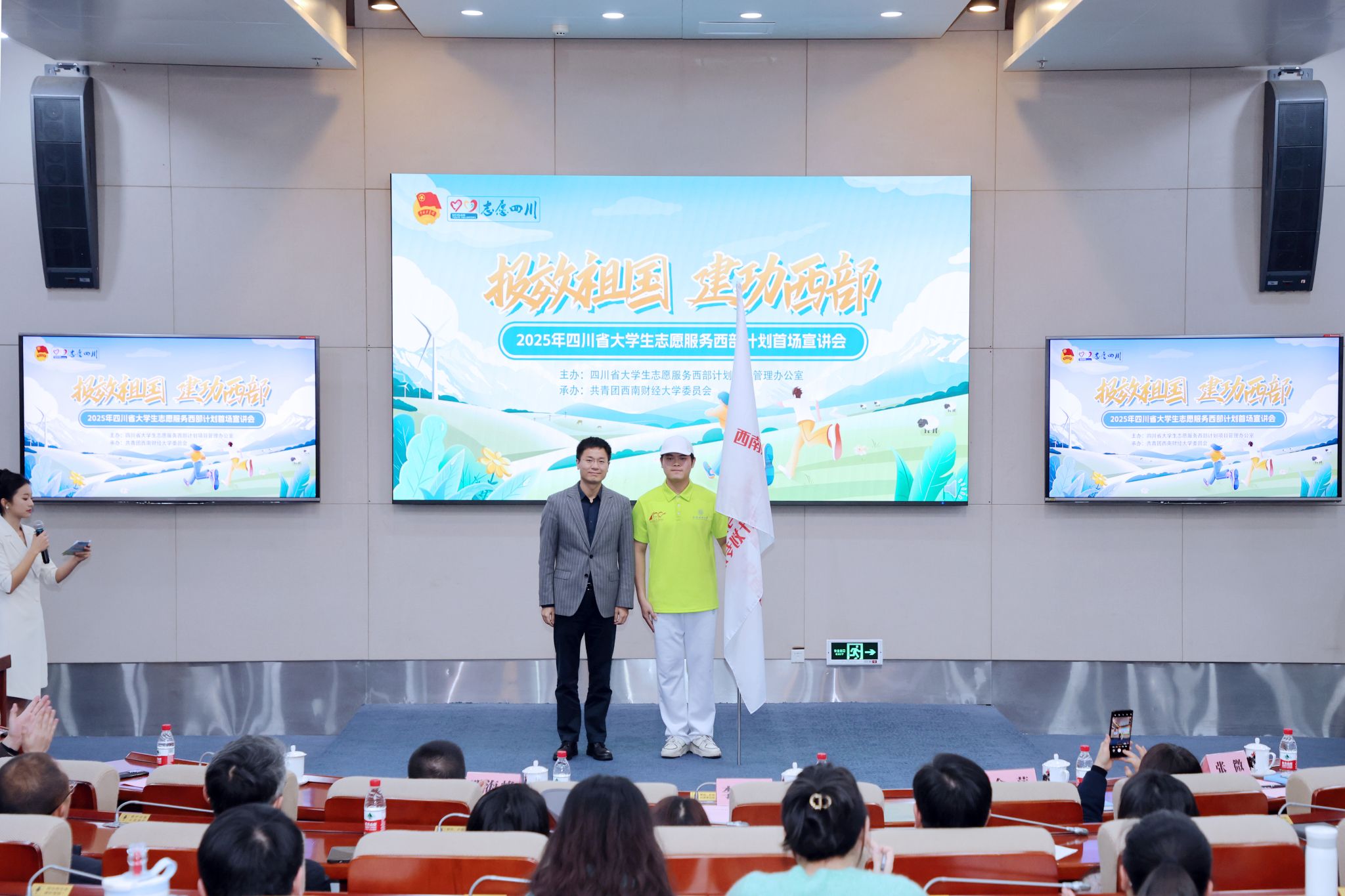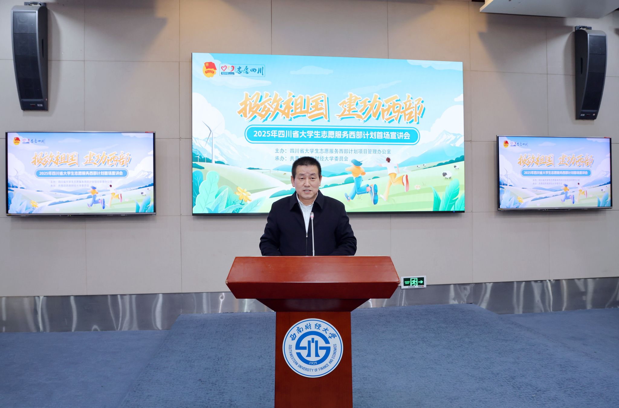 3月11日,2025年四川省大學生志愿服務西部計劃首場宣講會在學校柳林校區弘遠樓101會議室舉行。團省委副書記李佳林,學校黨委副書記明海峰出席宣講會。