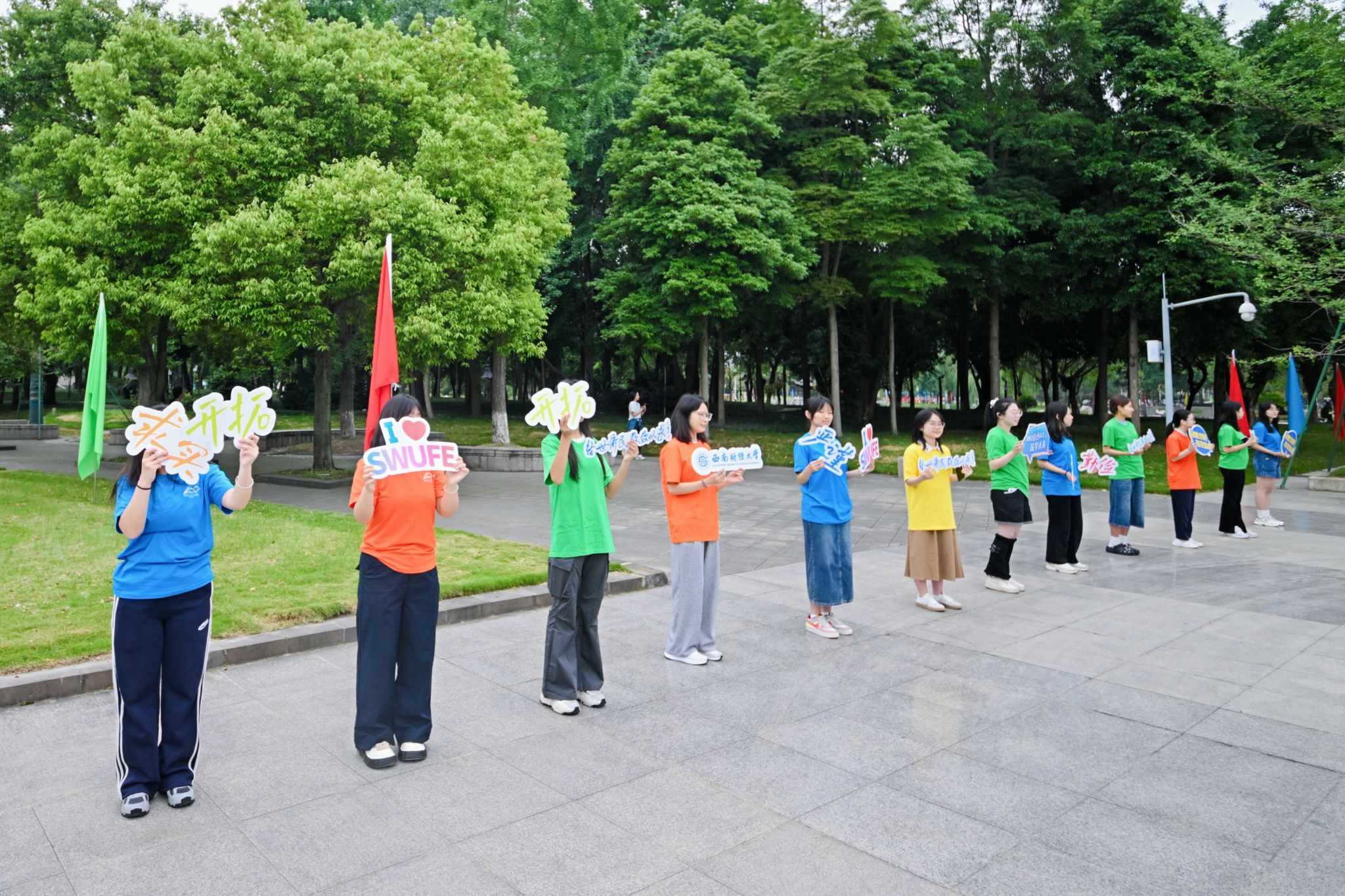 隊伍環繞濟民廣場而行,10余位西財師生身著紅裙翩翩起舞,裙擺飛揚間、激昂樂音中,盡顯對學校百年華誕的熱忱慶賀。經世樓前,年輕的朋友們列隊為大家加油鼓勁,鞭策著全體西財人以更加飽滿的姿態啟航新百年。道路兩側彩旗獵獵,師生們步履鏗鏘,滿懷加快建設財經特色鮮明的世界一流大學,為加快建設教育強國、金融強國貢獻更大西財力量的壯志豪情迎向勝利的終點。