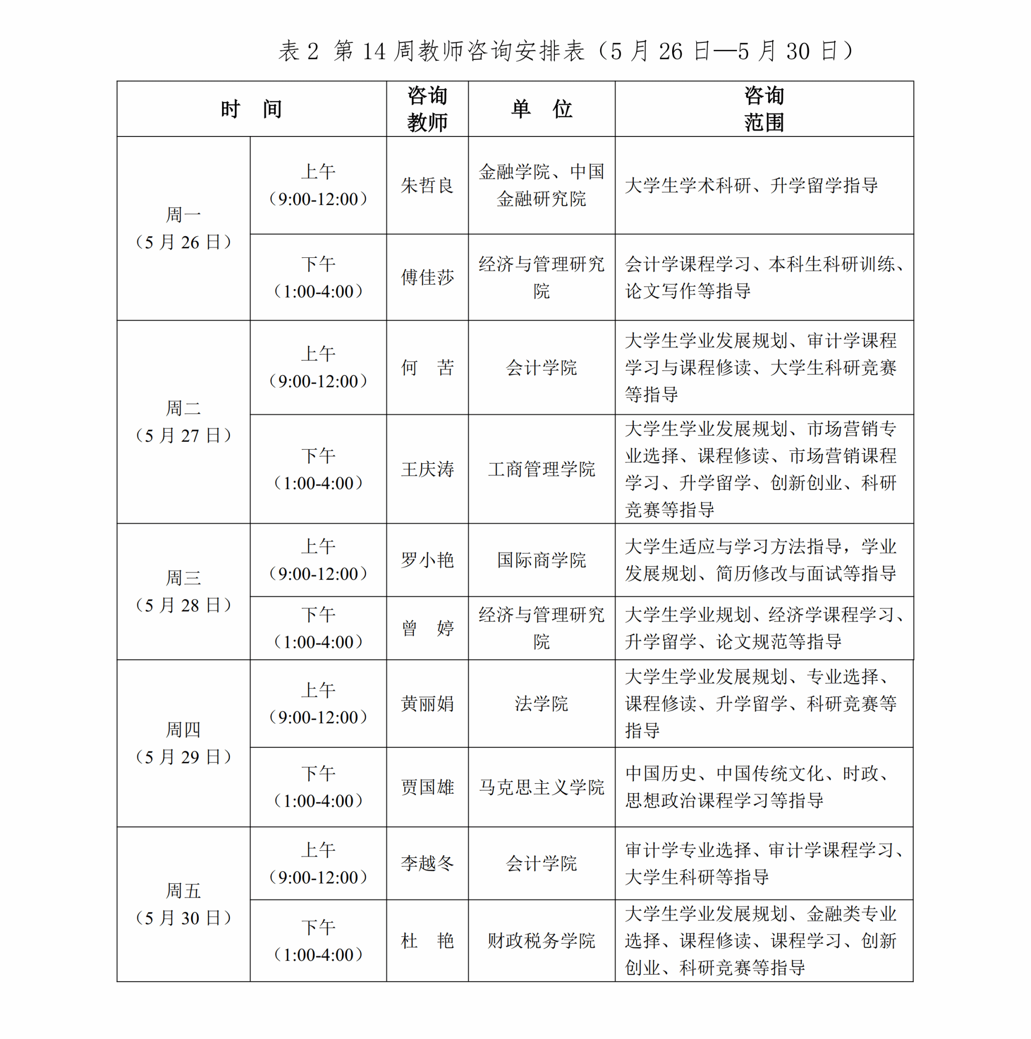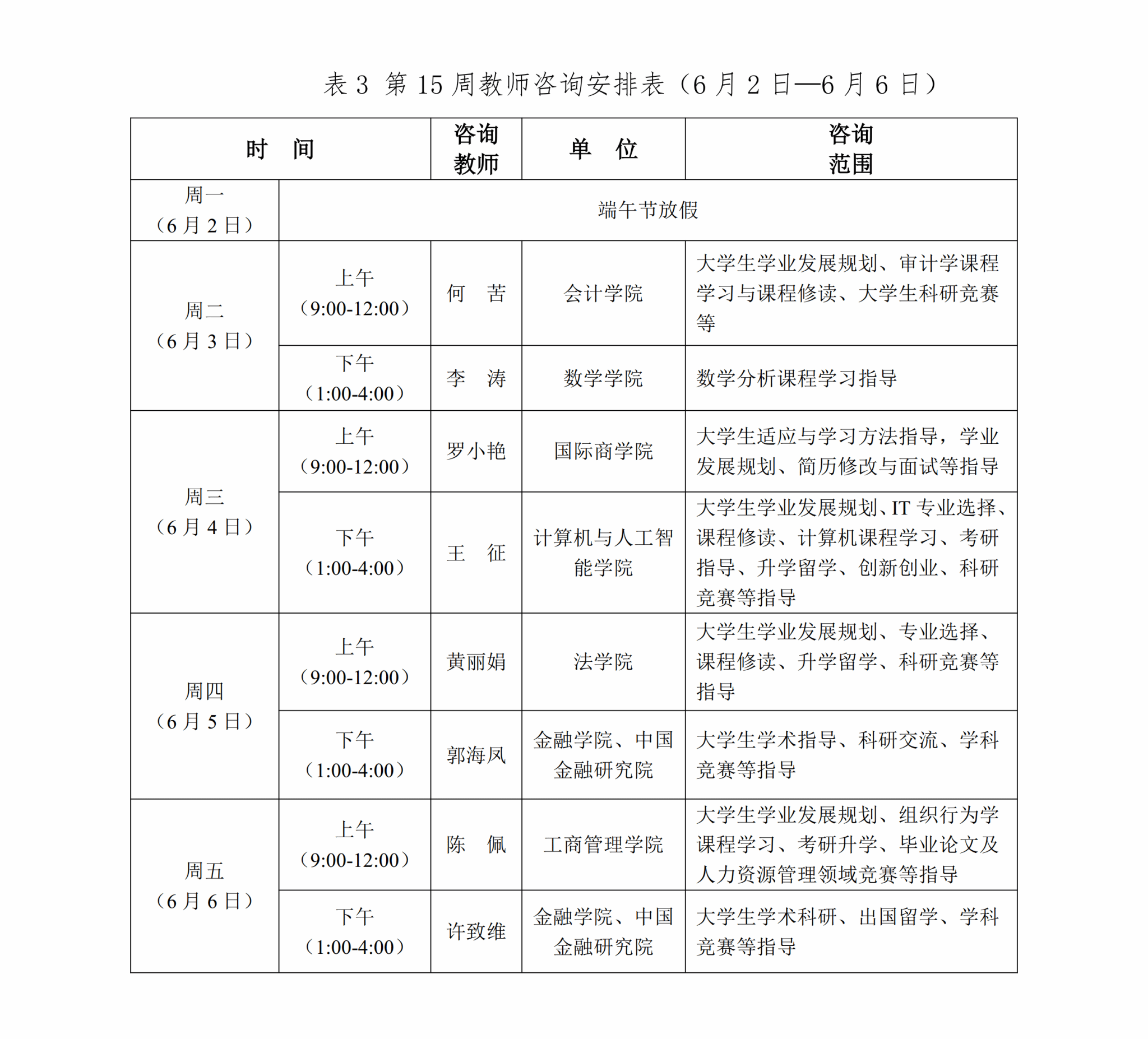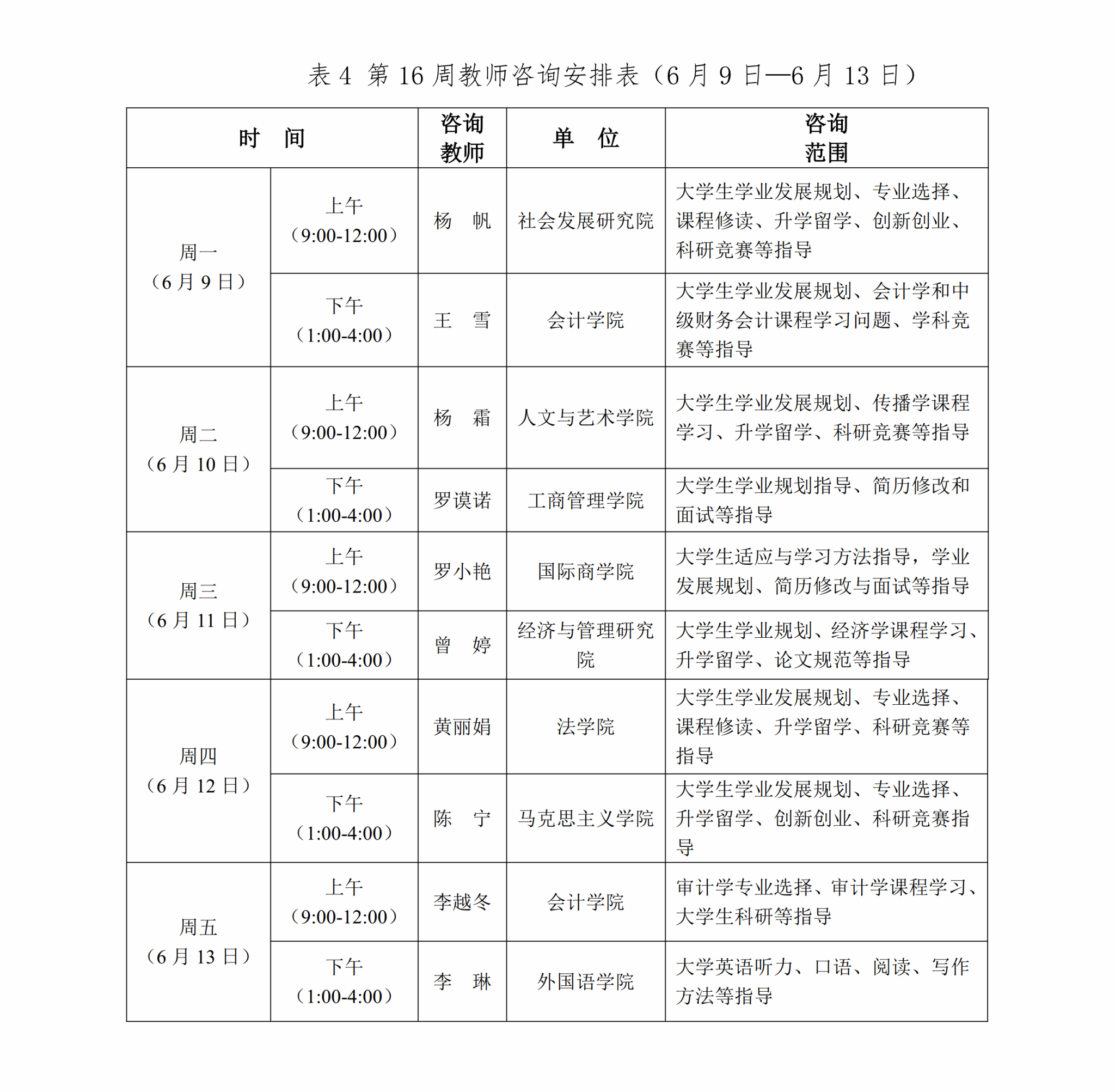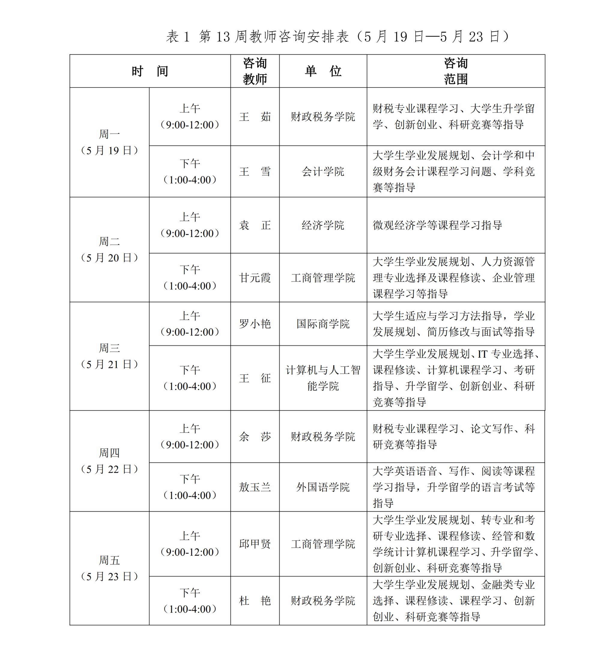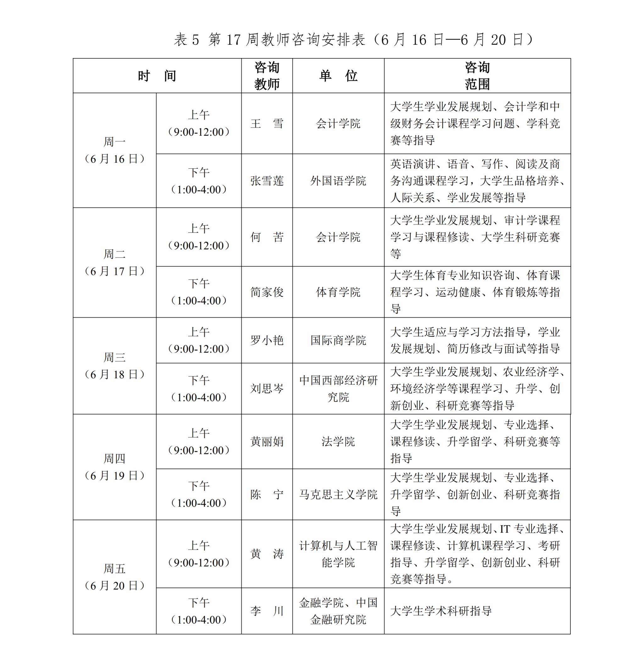 為推進課程教學范式深徹轉變,促進同學們學習理念、習慣、方式與時俱進,豐富大家在校學習體驗,提供學業規劃、學科內容、學業流程等方面的咨詢答疑,現將本學期第十三至十七周(5月19日—6月20日)教師咨詢安排通知如下: