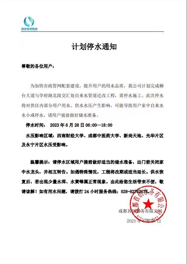 接自來水公司通知,6月28日(星期三)6:00—18:00自來水市政主管遷改工程施工,屆時柳林校區水壓將受到影響,高樓層可能出現停水現象。