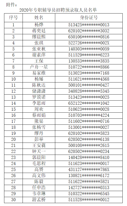根據(jù)公開招聘筆(面)試情況,經(jīng)學(xué)校研究,決定預(yù)錄取楊燁等30人參加學(xué)校統(tǒng)一組織的實習(xí),考核合格后錄取為我校專職輔導(dǎo)員,具體名單見附件。